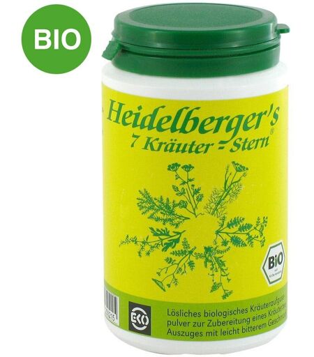 Anwendungsgebiet von Bio Heidelbergers 7 Kräuter Stern TeeBio Heidelbergers 7 Kräuter Stern Tee ist ein lösliches biologisches Kräuteraufgusspulver zur Zubereitung eines Kräutertees Auszuges mit leicht bitterem Geschmack. Die erlesenen Bitterkräuter sorgen dafür, dass die Gallensaftproduktion angeregt wird. Wirkstoffe / Inhaltsstoffe / ZutatenZutaten von Bio Heidelbergers 7 Kräuter Stern Tee: