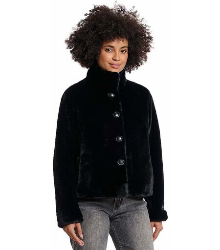 Kurze Damen Jacke aus flauschig-weichem Fellimitat Kragen Langarm Mit Knopfleiste Eingrifftaschen Gerade Passform Unifarben Farbbezeichnung: Black Material: 100% Polyester ...