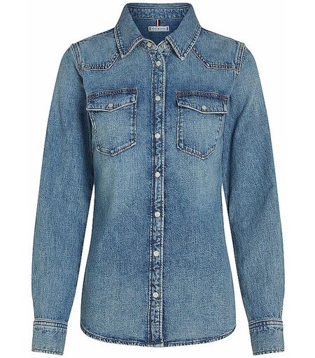 Damen Bluse aus Baumwoll-Denim Hemdblusenkragen Schließt mit Druckknöpfen Langarm mit Manschetten Aufgesetzte Brusttaschen Schmale Passform Farbbezeichnung: Denim Material: 80% Baumwolle, 20% recycelte Baumwolle ...