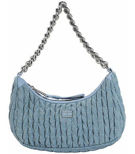 Damen Schultertasche aus Denim mit Steppung Details aus Kunstleder Schulterhenkel Kompakte Haptik Reißverschluss Kettengriff Reißverschlusstasche innen Tommy-Badge auf der Vorderseite Maße: 23 x 9 x 16 cm Farbbezeichnung: Blue Material: Textil / Baumwolle ...