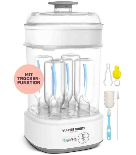 Für einen hygienischen und stressfreien Start ins Familienleben Als fürsorgliche Mama oder Papa liegt dir die Hygiene bei der Babypflege besonders am Herzen – und das zu Recht. Gerade in den ersten Lebensmonaten ist dein Baby besonders empfindlich gegenüber Keimen und Bakterien. Genau deshalb gibt es den Vulpes Goods® BabyCare Sterilisator PRO: Dein leistungsstarker Helfer für eine sichere, saubere und unkomplizierte Flaschenpflege – ganz ohne Chemie. Warum du einen Babyflaschen-Sterilisator brauchst Bakterien und Keime können bei Neugeborenen schnell zu Infekten führen. Mit dem Vulpes Goods Babyflaschen-Sterilisator kannst Du beruhigt sein: Durch die leistungsstarke Dampftechnologie werden 99,9 % aller Keime und Bakterien zuverlässig entfernt – ganz ohne aggressive Reinigungsmittel. So bekommt dein Baby nur das Beste – hygienisch und sicher. 5-in-1-Funktion – für maximalen Komfort im ...