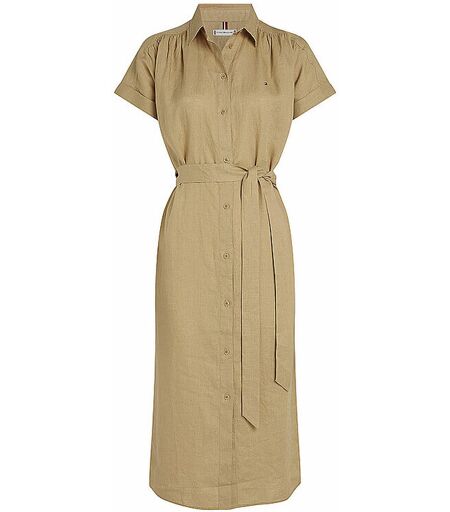 Modisches Damen Midikleid aus reinem Leinen Hemdblusenkragen Schließt mit Knopfleiste in der vorderen Mitte Kurzarm Raffung an den Schultern Bindegürtel in der Taille Gerade Passform Unifarben Farbbezeichnung: Beige Material: 100% Leinen ...