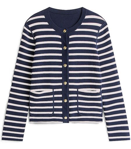 Wendebare Damen Strickjacke aus Bio-Baumwoll-Mischung Rundhalsausschnitt Schließt mit goldfarbenen Knöpfen Langarm Aufgesetzte Brusttaschen 1x Unifarben 1x Ringelmuster Farbbezeichnung: Blue Material: 94% Bio-Baumwolle, 6% Polyamid ...