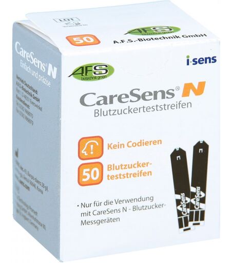 Anwendungsgebiet von Caresens N Blutzuckerteststreifen auto.codierendCaresens N Blutzuckerteststreifen auto.codierend ist ein In-Vitro Diagnostikum zur Eigenanwendung. Caresens N Blutzuckerteststreifen auto.codierend ist nur für die Verwendung mit CareSens N - Blutzuckermessgeräten geeignet.Wirkungsweise von Caresens N Blutzuckerteststreifen auto.codierendDie in der Blutsprobe enthaltene Glukose (Zucker) reagiert mit Chemikalien, enthalten im Teststreifen, und erzeugt dabei kleine elektrochemische Ladungen. Diese werden im CareSens N Messgerät gemessen und angezeigt. Sie geben die Blutzuckerkonzentration in mg/dL oder mmol/L an.DosierungAnwendungsempfehlung von Caresens N Blutzuckerteststreifen auto.codierend: Halten Sie die Spitze des Teststreifens vorsichtig an den Blutstropfen ohne dabei die Haut zu berühren. Eine sehr geringe Menge Blut (0,5 µl) reicht aus. Das CareSens N Messgerät bestimmt dann präzise und schnell in nur 5 Sekunden den Blutzuckergehalt.HinweiseLagern Sie die Teststreifen zwischen 1 - 30°C. Nicht in den Kühlschrank legen oder einfrieren. Teststreifendose nach Entnahme des Teststreifens gleich wieder verschließen. Benutzen Sie keine Teststreifen nach dem Ablaufdatum. Caresens N Blutzuckerteststreifen auto.codierend können in Ihrer Versandapotheke www.juvalis.de erworben werden. ...