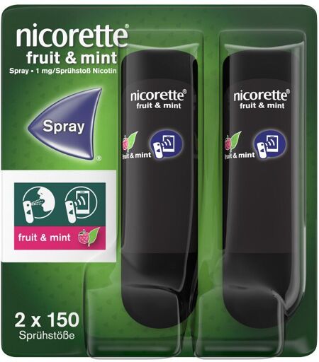 Mit nicorette® endlich aufhören zu rauchen Mit nicorette® endlich aufhören zu rauchen nicorette® fruit & mint Spray ist ein Nikotinspray zur Raucherentwöhnung, das Dich sowohl beim sofortigen Rauchstopp als auch bei Reduktion des Zigarettenkonsums mit dem Endziel Rauchfreiheit unterstützen kann. In nur 30 Sekunden lindert es mit 2 Sprühstößen Rauchverlangen und andere Entzugserscheinungen, die beim Aufhören mit dem Rauchen auftreten können, wie z. B. erhöhte Reizbarkeit und gesteigerter Appetit. Damit wirkt es schneller als andere Nikotinersatzprodukte und kann so insbesondere in kritischen Momenten helfen, nicht zu der Zigarette zu greifen. So geht's: Nikotinersatztherapie mit nicorette® Spray 1-2 Sprühstöße des nicorette® Sprays ersetzen eine Zigarette. Das Nikotin gelangt durch das Sprühen des Sprays in den Mund schnell über die Mundschleimhaut in die Blutbahn. Dadurch steigt der Nikotinspiegel im Blut und das Rauchverlangen wird gelindert. Bei der Raucherentwöhnung mit sofortigem Rauchstopp wird empfohlen, nicorette® Spray über 12 Wochen anzuwenden und über diesen Zeitraum die Sprühstöße und damit die Nikotinzufuhr zu reduzieren. ' Jetzt neu: Verbindung mit der Tracking-App nicorette® Nichtraucher“ Dank integriertem NFC-Chip kann mit der App jede Nutzung des nicorette® Sprays ganz einfach getrackt werden. Dazu das nicorette® Spray nach der Nutzung an die App halten und so einen Überblick über die Nutzung des nicorette® Sprays erhalten. Erstelle Dir Deinen Rauchstopp-Plan: durch das Setzen Deiner eigenen Ziele kannst Du deinen Fortschritt zu jeder Zeit tracken. Der integrierte Rechner zeigt Dir zudem auf, wie viele Zigaretten Du bisher verzichtet hast und wie viel Geld Du dadurch sparen konntest. Außerdem können zahlreiche Tipps zusätzlich helfen, motiviert zu bleiben Anwendung Entriegeln der Kindersicherung Nutze Deinen Daumen, um die Taste nach unten zu schieben, bis sie sich leicht nach innen drücken lässt. Übe dabei nicht zu viel Druck aus. Schiebe die Taste nach oben, während Du sie gedrückt hältst, bis der Sprühkopf herausgeschoben ist. Das Spray ist entriegelt. Richtig sprühen mit dem Spray Halte das Spray mit der Öffnung ganz nah an Deinen geöffneten Mund. Sprühe in die Mundhöhle oder in die seitliche Wangentasche, ohne dabei zu schlucken, einzuatmen, die Lippen zu benetzen, zu essen oder zu trinken. Drücke den Sprühkopf einmal fest von oben herunter. Wiederhole diesen Vorgang ein zweites Mal, wenn Dein Rauchverlangen nicht innerhalb weniger Minuten abnimmt. Verriegele das Spray danach wieder Dosierung 1-2 Sprühstöße ersetzen eine Zigarette. 1 Sprühstoß enthält 1 mg Nikotin. Wende maximal folgende Anzahl an Sprühstößen an: 2 Sprühstöße nacheinander 4 Sprühstöße pro Stunde 64 Sprühstöße pro Tag Zur Unterstützung bei der Raucherentwöhnung beim Versuch das Rauchen sofort aufzugeben oder zur Verringerung des Zigarettenkonsums (Rauchreduktion), um auf diesem Weg den Rauchausstieg zu erreichen. Zusammensetzung Wirkstoff: Nicotin... ...