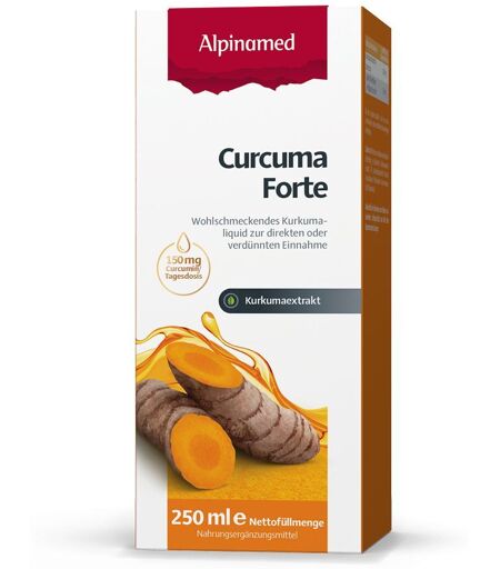 Nahrungsergänzungsmittel sind kein Ersatz für eine ausgewogene und abwechslungsreiche Ernährung und eine gesunde Lebensweise. Alpinamed® Curcuma Forte Kurkuma – hochdosiert, flüssig und gut verträglich Die farbkräftige Kurkumawurzel stammt ursprünglich aus Südostasien und gehört zur Familie der Ingwergewächse. Kurkuma ist bekannt für seine zahlreichen Gesundheitsvorteile und wird im Ayurveda seit tausenden Jahren für unterschiedlichste Einsatzgebiete verwendet. Heute sind die Inhaltsstoffe der Kurkumawurzel wissenschaftlich erforscht, wobei positive Effekte auf Immunsystem, Verdauung, Leber und Stoffwechsel festgestellt wurden. Perfekte Ergänzung in allen Lebensphasen: Ob zur Unterstützung von Immunsystem, Verdauung, Leber, Stoffwechsel, Gedächtnis oder Zellschutz: Kurkuma ist ein wahres Superfood. Hochwertiger Kurkumaextrakt: Zu den charakteristischen Inhaltsstoffen gehören die Curcuminoide, mit dem gelb-orangen Pflanzenstoff Curcumin. Alpinamed® Curcuma Forte enthält in der Tagesdosis 1.000 mg Kurkumawurzelextrakt mit 150 mg Curcumin. Für eine hohe Nährstoffaufnahme: Die Einbettung von Curcumin in eine natürliche Formulierung aus Stärke-Molekülen (Cyclodextrin) garantiert eine 85-fache Steigerung der Bioverfügbarkeit – bei gleichzeitig bester Verträglichkeit. Als flüssiges Kurkuma-Präparat: Das fruchtige Pfirsich-Aroma eignet sich perfekt zum Unterrühren (z.B. in Joghurts oder Shakes) und es entfällt das Schlucken einer Kapsel oder Tablette. Premium Rohstoffe: Vegan, frei von Laktose, Gluten und ohne Konservierungsmittel. Die Rohstoffauswahl und Herstellung unterliegen einem anspruchsvollen Prüfungs- und Qualitätssicherungsverfahren. Zutaten: Maltitol; Kurkumawurzelextraktzubereitung (γ-Cyclodextrin, Kurkumawurzelextrakt) 15 %; Wasser; Antioxidationsmittel: Vitamin C (Ascorbinsäure); Pfirsicharoma; Konservierungsstoff: Kaliumsorbat. Nährwerte:. Nährwerte enthalten in 1 Kapsel %NRV* Kurkumawurzelextraktzubereitung 1.000 mg - -davon für den Köper verfügbares Curcumin 150 mg - *Referenzmengen für die tägliche Zufuhr (NRV) Verzehrempfehlung: Zur Nahrungsergänzung nehmen Erwachsene einmal täglich 1 Teelöffel direkt ein oder lösen diesen in einer geeigneten Flüssigkeit (Wasser, Tee, Fruchtsaft etc.) auf. Der beiliegende Messlöffel entspricht 1 Portion bzw. 1 Teelöffel = 5 ml (6,75 g). Hinweis: Die täglich empfohlene Verzehrmenge darf nicht überschritten werden. Aufbewahrung: Außerhalb der Reichweite von Kindern aufbewahren. Kühl, trocken und lichtgeschützt aufbewahren. Nettofüllmenge: 250 ml Herstellerdaten: Gebro Pharma GmbH Bahnhofbichl 13 A-6391 Fieberbrunn ...