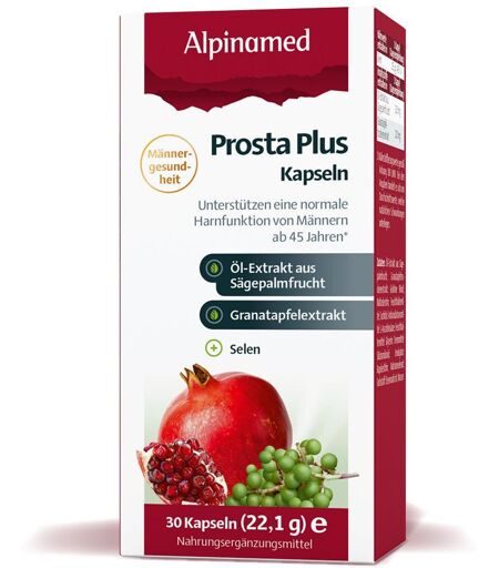 Nahrungsergänzungsmittel sind kein Ersatz für eine ausgewogene, abwechslungsreiche Ernährung und eine gesunde Lebensweise.Alpinamed® Prosta Plus Kapseln Unbeschwert die Blase entleert Über lästige "Männerangelegenheiten" wie nächtlichem Harndrang spricht man nicht gern, doch jeder zweite Mann über 50 leidet unter gutartigen Beschwerden beim Wasserlassen. Deshalb ist es wichtig, frühzeitig auf die Gesundheit zu achten. Neben regelmäßigen Vorsorgeuntersuchungen, gesunder Ernährung und ausreichend Bewegung können auch Pflanzenstoffe hilfreich sein. Die Alpinamed® Prosta Plus Kapseln enthalten 320 mg Sägepalmöl-Extrakt, 220 mg Granatapfeltrockenextrakt und 25 µg Selen – zur Unterstützung einer normalen Harnfunktion bei Männern ab 45 Jahren. * *Unterstützt den Harnfluss: Der Ölextrakt aus Sägepalmfrucht unterstützt eine normale Harnfunktion von Männern ab 45 Jahren. Bei nächtlichem Harndrang: Sägepalmfrüchte enthalten besondere Fettsäuren und Phytosterole, wie ß-Sitosterol, zur Unterstützung bei lästigen Beschwerden wie nächtlichem Harndrang. Für Immunsystem und Zellschutz: Das Spurenelement Selen ist wichtig für die Funktion von Proteinen und Enzymen. Es unterstützt das Immunsystem, den Zellschutz und die Bildung von Samenzellen. Zur Erhaltung der männlichen Vitalität: Granatapfel ist besonders reich an Polyphenolen wie der Ellagsäure. Die antioxidativen Eigenschaften fördern die männliche Vitalität in allen Lebensphasen. Premium Rohstoffe: Frei von Laktose, Gluten und Konservierungsmitteln. Die Rohstoffauswahl und Herstellung unterliegen einem anspruchsvollen Prüfungs- und Qualitätssicherungsverfahren. Zutaten: 320 mg Sägepalmölextrakt, 220 mg Granatapfelextrakt, 25 µg Selen Kapselhülle: Gelatine; L-Ascorbinsäure; Feuchthaltemittel: Glycerin, Wasser; Trennmittel: Siliciumdioxid; Farbstoff: Eisenoxidrot (E172); Natriumselenat.Nährwerte:Nährwerte enthalten in100 g1 Kapsel (Tagesempfehlung)Energiewert2326 kJ/ 559 kcal19,1 kJ/ 4,6 kcalEiweiß23,9 g0,2 gKohlenhydrate27,8 g0,23 gFett39,1 g0,32 gSelen3,05 mg25 µgBroteinheiten2,80,023Bei den Angaben handelt es sich um Durchschnittswerte, welche natürlichen Schwankungen unterliegen.Verzehrempfehlung:1 Kapsel täglich mit ausreichend Flüssigkeit einnehmen.Am besten zu einer Mahlzeit.Hinweis:Die angegebene empfohlene tägliche Verzehrmenge darf nicht überschritten werden.Lagerung:Außerhalb der Reichweite von kleinen Kindern lagern.Nettofüllmenge:30 Kapseln = 24 gHersteller:Gebro Pharma GmbHFieberbrunnÖsterreich ...