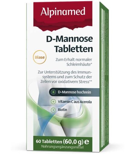 Nahrungsergänzungsmittel sind kein Ersatz für eine ausgewogene und abwechslungsreiche Ernährung und eine gesunde Lebensweise. Alpinamed D-Mannose + Biotin + Vitamin C Tabletten Praktisch & effektiv: D-Mannose in Tablettenform Begleitend in Phasen erhöhter Blasenbelastung, zum Beispiel bei Kälte, Reisen oder Stress. Zutaten: D-Mannose, Vitamin-C haltiger Acerolaextrakt; Trennmittel: pflanzliche Magnesiumsalze von Speisefettsäuren; Biotin. Wirkstoffe: 4000 mg hochreine D-Mannose (Reinheit ≥99%), D-Mannose gewonnen aus Mais (ohne Gentechnik), 24 mg Vitamin C aus Acerolaextrakt, 100μg Biotin. Verzehrempfehlung: Zur Nahrungsergänzung nehmen Erwachsene und Jugendliche ab 14 Jahren 1-2 mal täglich 2 Tabletten. Die Tabletten im Mund zergehen lassen, kauen oder mit etwas Flüssigkeit schlucken. Idealerweise erfolgt die letzte Einnahme am Abend nach dem letzten Toilettengang. Hinweis: Die empfohlene maximale Tagesdosis sollte nicht überschritten werden. Nicht geeignet für Kinder, Schwangere, Stillende und Personen, die an Diabetes mellitus Typ I oder II leiden oder eine krankhafte Störung des Kohlenhydratstoffwechsels haben sowie Personen mit Niereninsuffizienz. Aufbewahrung: Nicht über Raumtemperatur lagern. Außerhalb der Reichweiter von Kindern lagern. Nettofüllmenge: 60 Tabletten = 60 gHerstellerdaten: Gebro Pharma GmbH Fieberbrunn Österreich ...