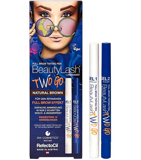 FULL BROW Tinting Pen TWO GO - Färbestifte für Augenbrauen. Es ist kein Mischen mehr notwendig, die Farbe wird in 2 einfachen Schritten mit den Stiften hintereinander aufgetragen. Das Ergebnis hält mehrere Wochen und ist wisch- und wasserfest. Dermatologisch und augenärztlich getestetAuch für Allergiker geeignetInhalt für bis zu 20 AnwendungenNur für Färbung von Augenbrauen geeignet Anwendung: 1. Vorbereiten + reinigen – Kontaktlinsen entfernen. Reinigung der Augenbrauen mit dem RefectoCil Augen Make-up Entferner. Für ein optimales Ergebnis müssen die Härchen trocken & fettfrei sein.2. Gel 1 auftragen - Den weißen Stift öffnen und so lange drehen bis die Pinselspitze mit Gel bedeckt ist. Nun das Gel direkt auf die Augenbrauen auftragen. Es sollen alle Härchen vollständig benetzt sein. 2 Minuten einwirken lassen, das Gel 1 wird vom Haar aufgesogen.3. Gel 1 abnehmen - Nach der Einwirkzeit von 2 Minuten das verbleibende Gel 1 mit einem trockenen Wattestäbchen oder Kosmetiktuch entfernen.4. Gel 2 auftragen - Den blauen Stift öffnen und so lange drehen bis die Pinselspitze mit Gel bedeckt ist. Das Gel 2 präzise mit der Pinselspitze auftragen. Die Haare sollten komplett vom Ansatz bis zur Spitze mit dem Gel bedeckt sein. Eine Minute einwirken lassen.Optional: Um die Haut präzise vor ungewollter Anfärbung zu schützen, empfehlen wir die Verwendung des Brow Mappers oder der RefectoCil Hautschutzcreme. Dazu einfach die Augenbrauen umranden. Achtung: Die Härchen sollten nicht damit in Kontakt kommen, da sonst die Farbe nicht wirkt! Tipp: Sollte die Haut trotzdem unbeabsichtigt Farbe abbekommen, empfehlen wir den RefectoCil Farbflecken-Entferner.5. Nach einer Minute Einwirkzeit das Gel 2 mit einem feuchten Wattepad entfernen. FERTIG! Die Färbung hält mehrere Wochen. ...