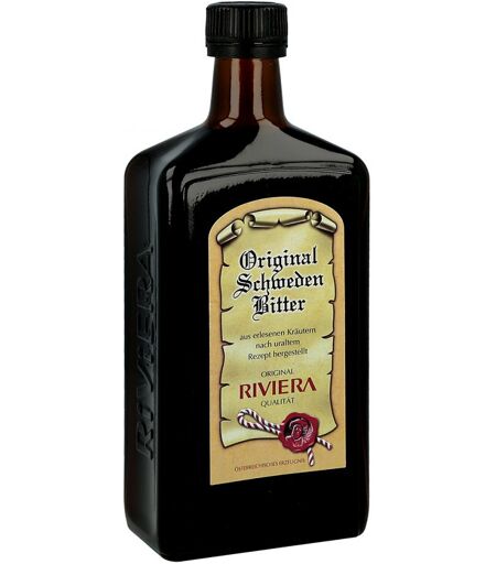 Original Schwedenbitter Riviera enthält keine Abführmittel, keine Zuckerzusätze, 38 Vol% Alkohol sowie E 150a als Farbstoff.Bei Raumtemperatur lagern.
