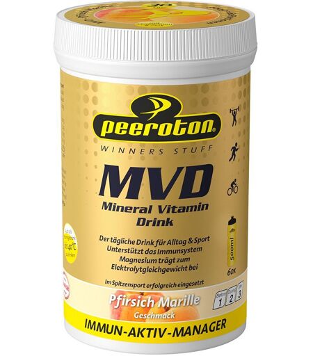 Bitte achten Sie auf eine ausgewogene und abwechslungsreiche Ernährung und eine gesunde Lebensweise. peeroton® MVD Mineral Vitamin Drink Pfirsich MarilleDer tägliche Drink für Alltag & Sport. Unterstützt das Immunsystem. Magnesium trägt zum Elektrolytgleichgewicht bei.Zutaten: Fructose, Maltodextrin (enthält SO2), Säuerungsmittel (Zitronensäure, Weinsäure), Pfirsichfruchtpulver, Kaliumcitrat, Dinatriumphosphat, Aroma, Calciumcarbonat, Magnesiumcarbonat, Süßstoffe (Natriumcyclamat, Natriumsaccharin), Natriumchlorid, mittelkettige Triglyceride aus Pflanzenöl, Füllstoff Gummi arabicum, Verdickungsmittel Xanthan, Vitamin C, Saccharose, Zinkgluconat, Eisengluconat, dl–alpha Tocopherylacetat, Niacin, Farbstoff (Beta Carotin), Panthotensäure, Vitamin B6, Vitamin B1, Vitamin B2, Chrom–III–chlorid hexahydrat, Maisstärke, Vitamin DNährwerte: Durchschnittliche Nährwerte: per 100 g per 4 Portionen à 4,5 g/2000 ml Wasser %RDA* Brennwert 1388 kJ / 326 kcal 250 kJ / 59 kcal Fett 0,4 g 0,1 g davon ges. Fettsäuren 0,4 g 0,1 g Kohlenhydrate 71 g 12,8 g davon Zucker 37,9 g 6,8 g Eiweiß 0,2 g 0,04 g Salz 4 g 0,7 g Kalium 1849 mg 333 mg 17 % Phosphor 785 mg 141 mg 20 % Calcium 669 mg 120 mg 15 % Magnesium 386 mg 70 mg 19 % Zink 16 mg 2,8 mg 28 % Eisen 12 mg 2,2 mg 16 % Chrom 100 µg 18 µg 45 % Vitamin C 258 mg 46 mg 58 % Niacin 28 mg 5,1 mg 32 % Vitamin E 16 mg 2,8 mg 24 % Panothensäure 9,2 mg 1,7 mg 28 % Vitamin B6 3,1 mg 0,6 mg 40 % Vitamin B2 2,4 mg 0,4 mg 31 % Vitamin B1 2,1 mg 0,4 mg 35 % Vitamin D 4 µg 0,8 µ 15 % BE 5,35 0,96 Verzehrempfehlung:4,5g (=1 Messlöffel) in einen trockenen Trinkbecher füllen und mit ¼ bis ½ l Wasser aufgießen.Hinweis:Die angegebene empfohlene Tagesmenge darf nicht überschritten werden.Aufbewahrung: Kühl (6-25 °C) und lichtgeschützt lagern. Außerhalb der Reichweite von Kindern aufbewahren.Nettofüllmenge:300 gHersteller: Peeroton G.m.b.H.Liechtensteinstraße 135 1090 Wien ...