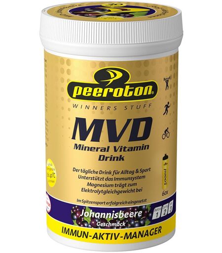 Nahrungsergänzungsmittel sind kein Ersatz für eine ausgewogene und abwechslungsreiche Ernährung und eine gesunde Lebensweise. Am besten täglich, frisch gemischt, nur 15kcal auf 0,5 Liter, im Winter auch als Warmgetränk Hotdrink bis 40Grad CelsiusIdeales Sport Getränk bei Belastungen und Trainings bis 60min Rasche Auffüllung des Elektrolytspeichers durch 9 Elektrolyte & Spurenelemente, plus Zink & Magnesium Hypotones Getränkepulver mit hochwertigen essentiellen Mineralstoffen und Vitaminen Kalorienarmer Durstlöscher - auch als Warmgetränk, Hotdrink, verwendbar. Frei von Industriezucker und Aspartam für jung bis alt Zink unterstützt das Immunsystem und die Abwehrkräfte Keine unnötigen Füllstoffe um die Dosen größer erscheinen zu lassen 300g Getränkepulver ergeben 30 Liter Gluten & Lactosefrei und ohne künstliche Farb- und Konservierungsstoffe Wirkung Das Peeroton MINERAL VITAMIN DRINK Getränkepulver ergänzt die Zufuhr der essentiellen Mineralstoffe und Vitamine, deren Bedarf durch Sport oder Stressbelastungen des Alltags erhöht ist. Die Beifügung von Eisen, Zink und Vitamin C tragen zu einer normalen Funktion des Immunsystems bei, Chrom verbessert die Spaltung von Kohlenhydraten und Proteinen.Verzehrsempfehlung 5g (=1 Messlöffel) Mineral Vitamin Drink–Getränkepulver in ein trockenes Gefäß füllen und mit ca. 1/2 l Wasser aufgießen.Eignung Normalerweise wird der Mineral Vitamin Drink mit Wasser aus der Leitung gemischt. Man kann jedoch auch einen Messlöffel mit Natur-Johurt mischen. Ganz lecker schmeckt es, wenn man den MVD mit Milch mischt, ein exzellenter Milch-Shake. Die ganz Kreativen mischen auch die Sorten untereinander, z.B. Mango/Papaya mit Erdbeere/Rhabarber Wer mehr Leistung haben will kann den MVD mit dem Kohlenhydrat Zusatz individuell mischen. Anzuwenden im Sport zur Leistungssteigerung, Lowcarb im Fitnesscenter und im Alltag der tägliche Mineralvitamin Drink zum Frühstück und im Büro.Zutaten Fruktose, Maltodextrin, Säuerungsmittel (Citronensäure, Weinsäure), Kaliumcitrat, Dinatriumphosphat, Johannisbeerensaftpulver, Aroma, Calciumcarbonat, Magnesiumcarbonat, Süßungsmittel Natriumcyclamat, Salz, mittelkettige Triglyceride aus Pflanzenöl (Kokos- und Palmkernöl), Füllstoff Gummi arabicum, Verdickungsmittel Xanthan, Ascorbinsäure (Vitamin C), Zucker, Süßungsmittel Natriumsaccharin, Zinkgluconat, Eisengluconat, dl-alpha Tocopherylacetat, Niacin, Farbstoff Anthocyanpulver, Calcium Pantothenat, Pyridoxol Hydrochlorid (Vitamin B6), Thiamin Hydrochlorid (Vitamin B1), Riboflavin (Vitamin B2), Chrom-III-chlorid hexahydrat, Maisstärke, Cholecalciferol (Vitamin D) Nährwertangabenpro 100g Pulver Per Tagesdosis =4 Portionen à 4,5g/ 200 ml Wasser %NRV*Energie1301 kJ / 305 kcal234 kJ / 55 kcalFett0,4 g0,1 gdavon ges. Fettsäuren0,4 g0,1 gKohlenhydrate61,6 g11,1 gdavon Zucker32,9 g5,9 gEiweiß0,4 g0,7 gSalz4,3 g0,77 gKalium1849 mg333 mg17 %Phosphor785 mg141 mg20 %Calcium669 mg120 mg15 %Magnesium386 mg70 mg19 %Vitamin C258 mg46 mg58 %Niacin28 mg5 mg32... ...