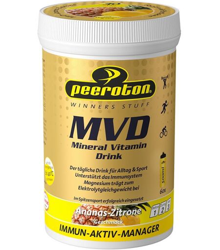 Bitte achten Sie auf eine abwechslungsreiche und ausgewogene Ernährung und gesunde Lebensweise.peeroton® MVD Mineral Vitamin Drink Ananas ZitroneDer tägliche Drink für Alltag & Sport. Unterstützt das Immunsystem. Magnesium trägt zum Elektrolytgleichgewicht bei.Zutaten: Fructose, Maltodextrin (enthält SO2), Säuerungsmittel (Zitronensäure, Weinsäure), Ananasfruchtpulver, Kaliumcitrat, Dinatriumphosphat, Aroma, Calciumcarbonat, Magnesiumcarbonat, Süßstoffe (Natriumcyclamat, Natriumsaccharin), Natriumchlorid, mittelkettige Triglyceride aus Pflanzenöl, Füllstoff Gummi arabicum, Verdickungsmittel Xanthan, Vitamin C, Saccharose, Zinkgluconat, Eisengluconat, dl–alpha Tocopherylacetat, Niacin, Farbstoff (Beta Carotin), Panthotensäure, Vitamin B6, Vitamin B1, Vitamin B2, Chrom–III–chlorid hexahydrat, Maisstärke, Vitamin DNährwerte: Durchschnittliche Nährwerte_ pro 100 g per 4 Portionen à 4,5 g/2000 ml Wasser %NRV* Brennwert 1358 kJ / 319 kcal 244 kJ / 57 kcal Fett 0,4 g 0,1 g davon ges. Fettsäuren 0,4 g 0,1 g Kohlenhydrate 64,1 g 11,5 g davon Zucker 30,7 g 5,5 g Eiweiß 0,1 g 0,01 g Salz 4,2 g 0,8 g Kalium 1849 mg 333 mg 17 % Phosphor 785 mg 141 mg 20 % Calcium 669 mg 120 mg 15 % Magnesium 386 mg 70 mg 19 % Zink 16 mg 2,8 mg 28 % Eisen 12 mg 2,2 mg 16 % Chrom 100 µg 18 µg 45 % Vitamin C 258 mg 46 mg 58 % Niacin 28 mg 5,1 mg 32 % Vitamin E 16 mg 2,8 mg 24 % Panothensäure 9,2 mg 1,7 mg 28 % Vitamin B6 3,1 mg 0,6 mg 40 % Vitamin B2 2,4 mg 0,4 mg 31 % Vitamin B1 2,1 mg 0,4 mg 35 % Vitamin D 4 µg 0,8 µ 15 % BE 5,35 0,96 Verzehrempfehlung:4,5g (=1 Messlöffel) in einen trockenen Trinkbecher füllen und mit ¼ bis ½ l Wasser aufgießen.Hinweis:Die angegebene Tagesverzehrmenge darf nicht überschritten werden.Aufbewahrung: Kühl (6-25 °C) und lichtgeschützt lagern. Nach dem Öffnen innerhalb von 3 Monaten aufbrauchen.Nettofüllmenge:300 gHersteller: Peeroton G.m.b.H.1090 Wien, Liechtensteinstraße 135 ...
