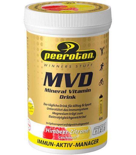Nahrungsergänzungsmittel sind kein Ersatz für eine ausgewogene und abwechslungsreiche Ernährung und eine gesunde Lebensweise.peeroton® MVD Mineral Vitamin Drink Himbeere ZitroneDer tägliche Drink für Alltag & Sport. Unterstützt das Immunsystem. Magnesium trägt zum Elektrolytgleichgewicht bei.Zutaten: Fruktose, Maltodextrin, Säuerungsmittel Zitronensäure, Himbeerfruchtpulver, Säurungsmittel Weinsäure, Aroma, Kaliumcitrat, Dinatriumphosphat, Rote Beete Saftpulver, Calciumcarbonat, Magnesiumcarbonat, Natriumchlorid, Süßungsmittel Natriumsaccharin, Verdickungsmittel Xanthan, L- Ascorbinsäure (Vitamin C), Mittelkettige Triglyceride aus Kokos, Zinkgluconat, Eisengluconat, dl-alpha Tocopherylacetat, Niacinamid, Calcium-D-pantothenat, Pyridoxolhydrochlorid, Thiaminhydrochlorid, Riboflavin, Saccharose, Trägerstoff Gummi arabicum, Chrom-III-chlorid Hexahydrat, Maisstärke, Cholecalciferol (Vitamin D)Nährwerte:MVD Himbeere Zitroneper 100 g Pulverper 4 Portionen a 4,5 g / 2000 ml Wasser%NRV*Energie1.360,04 kJ / 319,59 kcal244,80 kJ / 57,52 kcal Fett0,3 g0,06 g davon gesättigte Fettsäuren0,2 g0,04 g Kohlenhydrate96,1 g12,43 g davon Zucker34,8 g6,3 g Eiweiß0,7 g0,13 g Salz4 g0,7 g Kalium1.849 mg333 mg17 %Calcium669 mg120 mg15 %Magnesium386 mg70 mg19 %Zink16 mg2,8 mg28 %Eisen12 mg2,2 mg16 %Chrom100 µg18 µg45 %Vitamin C258 mg46,5 mg58 %Niacin28 mg5,1 mg32 %Vitamin E16 mg2,8 mg24 %Pantothensäure9,2 mg1,6 mg28 % Vitamin B6 3,1 mg0,6 mg40 %Riboflavin2,4 mg0,4 mg31 %Thiamin2,1 mg0,4 mg35 %Vitamin D4 µg0,8 µg15 %BE5,761,04 *) % der empfohlenen Tagesdosis gemäß NRV (Nährstoffbezugswert)Tagesdosis 4 Portionen à 4,5 g/ 2000 ml WasserVerzehrempfehlung:4,5g (=1 Messlöffel) MVD-Mineral Vitamin Drink–Getränkepulver in ein trockenes Gefäß füllen und mit ca. 1⁄2 l Wasser aufgießen.Hinweis:Die angegebene Tagesverzehrmenge darf nicht überschritten werden.Aufbewahrung:Kühl (6-25 °C) und lichtgeschützt lagern. Nach dem Öffnen innerhalb von 3 Monaten aufbrauchen.Nettofüllmenge:300 gHersteller:Peeroton G.m.b.H. Liechtensteinstraße 135 1090 Wien ...