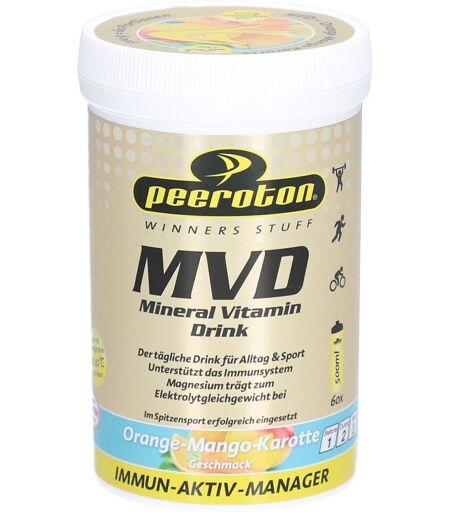Nahrungsergänzungsmittel sind kein Ersatz für eine ausgewogene und abwechslungsreiche Ernährung und eine gesunde Lebensweise. Peeroton MVD ist ein zuckerfreier Mineral-Vitamin-Drink zur Unterstützung des Immunsystems und zur optimalen Hydrierung. Mit Zink, Vitamin C sowie wichtigen Elektrolyten sorgt der Drink für eine effektive Versorgung vor, während und nach dem Sport. Eine Dose ergibt bis zu 30 Liter Getränk und eignet sich auch ideal als Warmgetränk bis 40 °C – ohne Aspartam, gluten- und laktosefrei. Zutaten: Zitronensäure, Natriumcitrat, Natriumhydrogencarbonat, Kaliumchlorid, Magnesiumcarbonat, Natriumchlorid, Calciumcarbonat, Aroma, Zinkcitrat, Vitamin C (Ascorbinsäure), Süßungsmittel: Sucralose, Farbstoffe (Beta-Carotin), Trennmittel: Siliciumdioxid. Nährwertangaben Nährwertpro Portion (10 g in 500 ml Wasser)%NRV Energie35 kJ / 8 kcal– Fett0 g– davon gesättigte Fettsäuren0 g– Kohlenhydrate<0,5 g– davon Zucker<0,5 g– Eiweiß0 g– Salz0,9 g– Vitamin C80 mg100% Zink10 mg100% Magnesium60 mg16% Kalium150 mg7,5% Calcium120 mg15% Natrium350 mg– Verzehrempfehlung 10 g Pulver (1 Messlöffel) in 500 ml Wasser einrühren. Trinken vor, während oder nach dem Sport. Auch als Warmgetränk bis 40 °C geeignet. Hinweise & Aufbewahrung Kühl, trocken und lichtgeschützt lagern. Nach dem Öffnen innerhalb von 3 Monaten aufbrauchen. Für Kinder unzugänglich aufbewahren. Nettofüllmenge 300 g (ergibt ca. 30 Liter) Hersteller Peeroton GmbH Österreich ...