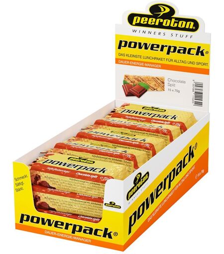 Bitte achten Sie auf eine abwechslungsreiche und ausgewogene Ernährung und gesunde Lebensweise.peeroton® Powerpack Riegel Chocolate Split Schmeckt - Sättigt – Stärkt Langanhaltende Energieverfügbarkeit Hohe Magen- und Darmverträglichkeit auch bei intensiver Belastung Handgemachter Haferflockenriegel ohne Industriezucker und ohne Süssungsmittel Viele leckere Geschmackrichtungen für Jeden etwasDient als gesunder Mahlzeitenersatz im Alltag und liefert lang anhaltende Energie beim Sport. Durch seine hohe Magen–/Darmverträglichkeit auch während des Trainings/Wettkampfes empfehlenswert. Ein spezielles Backverfahren sichert sowohl bei hohen, als auch bei niedrigen Außentemperaturen die Konsistenz des Riegels und deshalb bleibt er in allen Lebenslagen gut essbar.Zutaten:Junge Haferflocken, Zuckerrohrsirup, Schokolade (Kakaomasse, Zucker Emulgator Sojalecitin, Vanille Extrakt), pflanzliche Margarine (Pflanzenöl, Waser, Emulgator: E471, Farbstoffe: E160b & E100, natürlicher Geschmack)Nährwerte: Durchschnittliche Nährwerte: per 100g per 70g Energie 1.736 kJ / 415 kcal 1.119 kJ / 267 kcal Fett 18 g 12 g davon gesättigte Fettsäuren 6,8 g 4,8 g Kohlenhydrate 55 g 39 g davon Zucker 31 g 22 g Ballaststoffe 5,5 g 3,9 g Eiweiß 6,4 g 4,5 g Salz 0,26 g 0,18 g Verzehrempfehlung: Keine besonderen Verzehrhinweise.Hinweis:Die angegebene empfohlene tägliche Verzehrmenge darf nicht überschritten werden.Aufbewahrung:Kühl (6-25 °C) und lichtgeschützt lagern. Außerhalb der Reichweite von Kindern aufbewahren.Nettofüllmenge: 15 x 70 gHerstellerdaten: Peeroton GmbH Liechtensteinstraße 135 1090 Wien ...