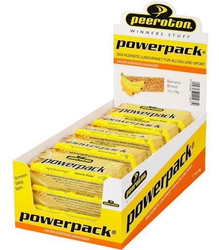 Nahrungsergänzungsmittel sind kein Ersatz für eine ausgewogene und abwechslungsreiche Ernährung und eine gesunde Lebensweise.peeroton® Powerpack Riegel Banana Bread Schmeckt - Sättigt – Stärkt Langanhaltende Energieverfügbarkeit Hohe Magen- und Darmverträglichkeit auch bei intensiver Belastung Handgemachter Haferflockenriegel ohne Industriezucker und ohne Süssungsmittel Viele leckere Geschmackrichtungen für Jeden etwasDient als gesunder Mahlzeitenersatz im Alltag und liefert lang anhaltende Energie beim Sport. Durch seine hohe Magen–/Darmverträglichkeit auch während des Trainings/Wettkampfes empfehlenswert. Ein spezielles Backverfahren sichert sowohl bei hohen, als auch bei niedrigen Außentemperaturen die Konsistenz des Riegels und deshalb bleibt er in allen Lebenslagen gut essbar.Zutaten: Haferflocken, Golden Sirup, getrocknete Bananen, Pflanzliche Margarine (Palmöl, Rapsöl, Wasser, Emulgator E471, Natürliche pflanzliche Farbstoffe und Curcumin, Aromen), Weizenmehl, Erdnüsse, Farbstoff Zuckercouleur, Aromen. Allergiehinweis: Allergene sind in Fettbuchstaben gekennzeichnet. Kann Spuren von Weizen, Gerste, Eier, Soja, Erdnüsse und Schwefeldioxide enthalten, die im Herstellungsbetrieb verarbeitet werden. Für glutenintolerante Personen nicht geeignet! Achtung: Kann Nussschalen enthalten.Nährwerte: Durchschnittliche Nährwerte: per 100g per 70g Energie 1.598 kJ / 381 kcal 1.119 kJ / 267 kcal Fett 14,4 g 10,1 g davon gesättigte Fettsäuren 4,7 g 3,3 g Kohlenhydrate 51,6 g 31,6 g davon Zucker 18,8 g 13,1 g Ballaststoffe 5,1 g 3,5 g Eiweiß 6,4 g 4,5 g Salz 0,15 g 0,1 g Verzehrempfehlung: Keine besonderen VerzehrhinweiseHinweis:Die angegebene empfohlene tägliche Verzehrmenge darf nicht überschritten werden.Aufbewahrung:Kühl (6-25 °C) und lichtgeschützt lagern. Außerhalb der Reichweite von Kindern aufbewahren.Nettofüllmenge: 15 x 70 gHerstellerdaten: Peeroton GmbH Liechtensteinstraße 135 1090 Wien ...