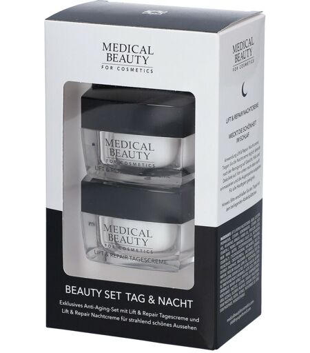 MEDICAL BEAUTY Lift & Repair Tages- und Nachtcreme Dieses Set enthält: 1 x MEDICAL BEAUTY Lift & Repair Tages- und Nachtcreme 1 x MEDICAL BEAUTY Lift & Repair Tages- und Nachtcreme MEDICAL BEAUTY Lift & Repair Tagescreme Intensive Faltenkorrektur Die fortschrittlich formulierte Tagescreme hilft, das Erscheinungsbild selbst bei tieferen Falten sichtbar zu korrigieren. Die Regeneration der Haut wird unterstützt und der vorzeitigen Hautalterung vorgebeugt. Die Haut gewinnt an Dichte, Elastizität und wirkt merklich straffer, das Hautbild erstrahlt zeitlos jugendliche und schön. Luxuriöse Pflege Besonders reines Gletscherwasser und der beruhigende sowie hydratisierende Pflegekomplex entlasten beanspruchte Haut und verwöhnen mit einem angenehm entspannten Hautgefühl. MEDICAL BEAUTY Lift & Repair Nachtcreme Hautregeneration und Faltenglättung Die exklusive Nachtcreme fördert die Hauterneuerung und beugt vorzeitiger Faltenbildung vor. Das Hautbild wirkt glatter und der Teint strahlend frisch. Darüber hinaus hilft ein prämierter Wirkstoff, selbst ausgeprägte Falten sichtbar zu korrigieren – für möglichst lang währende, jugendliche Schönheit. Optimale Pflege Die Haut wird beruhigt, mit kostbarer Feuchtigkeit durchflutet, und Irritationen werden gelindert. Nährende Vitaminöle und Seidenproteine verleihen ein erholtes Hautgefühl am Morgen. Anwendung MEDICAL BEAUTY Lift & Repair Tagescreme Tragen Sie die Tagescreme täglich morgens nach der Reinigung auf Gesicht, Hals und Dekolleté auf. Von unten nach oben sanft einmassieren und die Augenpartie aussparen. Für alle Hauttypen geeignet. MEDICAL BEAUTY Lift & Repair Nachtcreme Tragen Sie die Nachtcreme täglich abends nach der Reinigung auf Gesicht, Hals und Dekolleté auf. Von unten nach oben sanft einmassieren und die Augenpartie aussparen. Für alle Hauttypen geeignet. Zusammensetzung MEDICAL BEAUTY Lift & Repair Tagescreme AQUA, CAPRYLIC/CAPRIC TRIGLYCERIDE, DECYL OLEATE, CETEARYL ALCOHOL, BENZYL ETHER MYRISTATE, GLYCERIN, HYDROGENATED COCO-GLYCERIDES, PSEUDOALTEROMONAS FERMENT EXTRACT, SAPONARIA PUMILA CALLUS CULTURE EXTRACT, ACETYL HEXAPEPTIDE-51 AMIDE, ACETYL SH-PENTAPEPTIDE-35, TOCOPHEROL, DIAMOND POWDER, PHOSPHOLIPIDS, OLUS OIL, HYDROGENATED VEGETABLE OIL, SILICA, MYRISTYL MYRISTATE, SODIUM STEAROYL GLUTAMATE, XANTHAN GUM, ISOMALT, LACTIC ACID, SALICYLIC ACID, SODIUM POLYACRYLATE, SODIUM HYDROXIDE, BUTYLENE GLYCOL, ETHYLHEXYLGLYCERIN, SODIUM BENZOATE, PHENOXYETHANOL, PARFUM, LIMONENE, HYDROXYCITRONELLAL, ALPHA-ISOMETHYL IONONE, HEXYL CINNAMAL, CITRONELLOL, LINALOOL MEDICAL BEAUTY Lift & Repair Nachtcreme 1 AQUA A (>=50%) 3 MACADAMIA TERNIFOLIA SEED OIL E (>=1%) 4 CETEARYL ISONONANOATE E (>=1%) 5 GLYCERYL STEARATE E (>=1%) 6 BUTYROSPERMUM PARKII BUTTER E (>=1%) 8 HYDROGENATED ETHYLHEXYL OLIVATE E (>=1%) 9 CETEARYL ALCOHOL E (>=1%) 10 CYCLOHEXASILOXANE E (>=1%) 11 PROPANEDIOL E (>=1%) 12 PHENOXYETHANOL E (>=1%) 13 ZEA MAYS GERM OIL E (>=1%)... ...