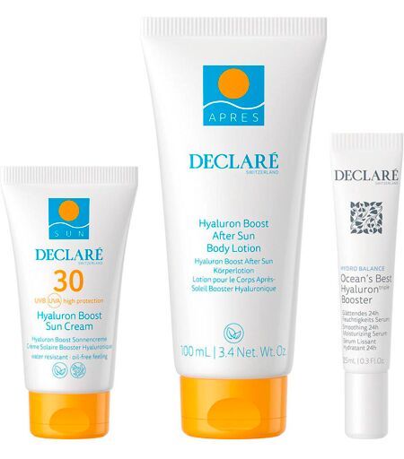 Das Hyaluron Boost Kennenlern-Set von Declaré! Dieses Set enthält: 1 x Hyaluron Boost After Sun Body Lotion, 100 ml1 x Hyaluron Boost Sun Cream SPF 30, 25 ml1 x Ocean‘s Best Hyalurontriple Booster, 15 ml Hyaluron Boost After Sun Body Lotion: Spendet Feuchtigkeit und beruhigt sonnenstrapazierte Haut. Die Lotion wirkt dem austrocknenden Effekt der Sonne entgegen und unterstützt eine langanhaltende, schöne Bräune. Für gepflegte und zarte Haut nach dem Sonnenbad. Vegan. Swiss Clean Beauty. Hyaluron Boost Sun Cream SPF 30: Hyaluron Boost Sonnenpflege für empfindliche Haut. Schützt vor Sonnenbrand, beugt den Zeichen vorzeitiger Hautalterung wie feinen Linien, Pigmentflecken, Sonnenfältchen vor und unterstützt eine gleichmäßige Bräune der Haut. Mit Declaré SRC™complex. Ocean friendly. Wasserfest. Ständigen Schutz vor UV-Strahlen. Vegan. Swiss Clean Beauty. Ocean‘s Best Hyalurontriple Booster: Perfekte Kombination dreier Hyaluronsäuren mit Meeresextrakten für die strahlende Schönheit Ihrer anspruchsvollen Haut. Das hochaktive Serum sorgt für sofortige Feuchtigkeit, herrliche Erfrischung und Regeneration. Eine wirkungsvolle Kombination dreier Hyaluronsäuren (lang- und kurzkettig, quervernetzt) sorgt für den besonderen Effekt. Feine Linien und Fältchen werden gemildert, die Haut wirkt straffer und praller. Meeres-Mineralien, Spurenelementen, Algen und Seetang-Extrakten unterstützen die Zellaktivität und wirken zusammen mit dem SRC™ complex gegen die äußeren Zeichen von Stress und Müdigkeit. Mit 24-Stunden Feuchtigkeitswirkung. Für glatte, frische Haut mit neuer Strahlkraft. Vegan. Swiss Clean Beauty. Anwendung: Hyaluron Boost After Sun Body Lotion: Nach der Dusche auf die gereinigte Haut auftragen und sanft einmassieren. Hyaluron Boost Sun Cream SPF 30: Vor dem Aufenthalt an der Sonne gleichmäßig und großzügig auftragen, zu geringe Auftragsmengen reduzieren die Schutzleistung. Wiederholt anwenden, um die Schutzwirkung aufrecht zu erhalten, speziell nach dem Aufenthalt im Wasser. Intensive Mittagssonne vermeiden! Babys und Kleinkinder vor direkter Sonneneinstrahlung schützen, schützende Kleidung sowie Sonnenschutzmittel mit sehr hohem Schutzfaktor (SPF höher als 25) verwenden. Auch Sonnenschutzprodukte mit hohen Schutzfaktoren bieten keinen vollständigen Schutz vor UV-Strahlen. Ocean‘s Best Hyalurontriple Booster: Morgens und Abends nach der Reinigung unter gewohntes Pflegeprodukt auftragen. Drehen Sie den Verschluss gegen den Uhrzeigersinn (ca. ½ Umdrehung), der Drop-Mechanismus wandert nach oben und die Pipette füllt sich gleichzeitig mit dem Serum. Drehen Sie den Verschluss nun weiter gegen den Uhrzeigersinn, um das Fläschchen zu öffnen. Durch den Druck auf den Deckel fließt das Serum aus der Pipette. ...