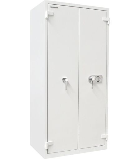 Feuerbeständigkeit: 1 Stunde für Papierdokumente jeder Art doppelwandig, Lackfarbe des Schranks RAL 7035 mit Tresorsicherheitsschloss für Schlüssel Klasse A nach EN 1300 oder mit elektronischem Schloss geliefert Klasse B nach EN 1300 (ohne mechanische Notöffnung) 3-seitiger Verriegelungsmechanismus die Außenscharniere ermöglichen einen Öffnungswinkel von bis zu 180° Sicherheitsstufe S2 gemäß Norm EN14450 Eigenschaften: Volumen (l): 549, Gewicht (kg): 662, Schloss: elektronisch - Codeschloss, Anzahl Aktenordner: 50, Anzahl Regalböden: 4, Farbe: grau, Außenmaße H x B x T (mm): 1950 x 940 x 585, Innenmaße H x B x T (mm): 1760 x 800 x 390, Sicherheitsstufe: S2, Feuerbeständigkeit: Ja, Außenbreite (mm): 940, Außenhöhe (mm): 1950, Innenbreite (mm): 800, Innenhöhe (mm): 1760, Außentiefe (mm): 585, Innentiefe (mm): 390, Feuerbeständigkeit für Papier: 60 min ...