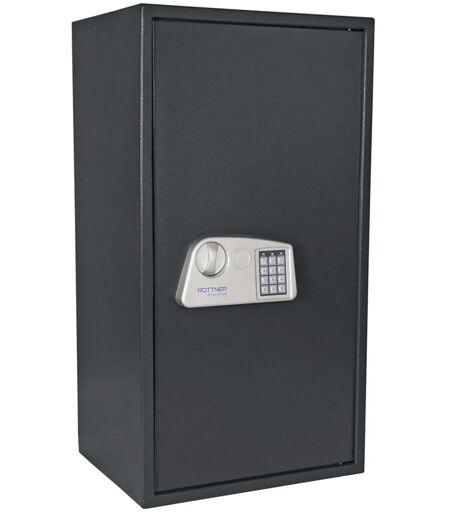 Tresor zur Aufbewahrung von Brieftaschen, persönlichen Dokumenten, kleinen Wertgegenständen oder Schmuck Einwandiger Tresor aus hochwertigem Stahl mit elektronischem Schloss Batteriebetrieb mit 4 Stück 1,5 Volt AA Batterien (nicht im Lieferumfang enthalten) 2 Schlüssel für die mechanische Notöffnung mitgeliefert 2 mm dickes Gehäuse Türendicke 4 mm Maximaler Türöffnungswinkel 90° Türhöhe 808 mm, Türbreite 410 mm Zwei verstellbare Einlegeböden innen (beide sind herausnehmbar) 4 Bohrungen zur Verankerung auf der Unterseite (Bohrungsdurchmesser 6 mm) 4 Bohrungen zur Verankerung auf der Rückseite (Bohrungsdurchmesser 6 mm) inklusive Befestigungsmaterial Eigenschaften: Außenmaße H x B x T (mm): 850 x 450 x 360, Innenmaße H x B x T (mm): 843 x 443 x 290, Anzahl Regalböden: 2, Volumen (l): 108,3, Farbe: Anthrazit, Gewicht (kg): 30, Schloss: elektronisch - Codeschloss, Sicherheitsstufe: -, Schließfach innen: -, Feuerbeständigkeit: -, Einlassöffnung (mm): 840 x 440, Außenbreite (mm): 450, Außenhöhe (mm): 850, Innenbreite (mm): 443, Innenhöhe (mm): 843, Außentiefe (mm): 360, Innentiefe (mm): 290, Breite Einlassöffnung (mm): 440, Höhe Einlassöffnung (mm): 840 ...