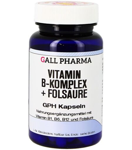 Nahrungsergänzungsmittel sind kein Ersatz für eine ausgewogene und abwechslungsreiche Ernährung und eine gesunde Lebensweise.GALL PHARMA Vitamin B-Komplex + Folsäure GPH Vitamin B-Komplex + Folsäure GPH Kapseln enthalten 1,4 mg Vitamin B1 (Thiaminhydrochlorid), 2 mg Vitamin B6 (Pyridoxinhydrochlorid), 3 µg Vitamin B12 (Cyancobalamin) und 300 µg Folsäure in drei Hartgelatinekapseln.Die Gruppe der B-Vitamine wird auf Grund ihrer Wasserlöslichkeit im Körper nicht gespeichert und sollte durch die Nahrung oder Ergänzungen ausreichend zugeführt werden. Insbesondere die Folsäure und Vitamin B12 arbeiten sehr eng zusammen und sind für den Eiweißstoffwechsel wichtig.Darüber hinaus arbeitet die Folsäure als essentielles Coenzym in allen Zellen. Sie ist an der Bildung von DNS/RNS (Erbinformation) beteiligt, sowie an den Enzymen der Zellteilung. Sie reguliert die embryonale Entwicklung des Nervensystems. Sie dient der Erhaltung des Nervensystems, des Verdauungstraktes, der Sexualorgane, der weißen Blutkörperchen und des Wachstums.Durch ihre gleichzeitige Einnahme ergänzen sich diese B-Vitamine in ihrer Wirkung. Zusammen haben sie eine regulierende und unterstützende Wirkung auf den Kohlenhydrat-, Fett- und Eiweißstoffwechsel und große Bedeutung für das Nervensystem. Ihre Zufuhr bewirkt eine Steigerung der Leistungsfähigkeit, des körperlichen Wohlbefindens und der Belastbarkeit.Thiamin (Vitamin B1) trägt zu einem normalen Energiestoffwechsel bei zu einer normalen Funktion des Nervensystems bei zur normalen psychischen Funktion bei zu einer normalen Herzfunktion beiVitamin B6 trägtzu einer normalen Cystein-Synthese bei zu einem normalen Energiestoffwechsel bei zu einer normalen Funktion des Nervensystems bei zu einem normalen Homocystein- Stoffwechsel bei zu einem normalen Eiweiß- und Glycogenstoffwechsel bei zur normalen psychischen Funktion bei zur normalen Bildung roter Blutkörperchen bei zu einer normalen Funktion des Immunsystems bei zur Verringerung von Müdigkeit und Ermüdung bei zur Regulierung der Hormontätigkeit beiVitamin B12 trägtzu einem normalen Energiestoffwechsel bei zu einer normalen Funktion des Nervensystems bei zu einem normalen Homocystein- Stoffwechsel bei zur normalen psychischen Funktion bei zu einer normalen Bildung roter Blutkörperchen bei zu einer normalen Funktion des Immunsystems bei zur Verringerung von Müdigkeit und Ermüdung bei und hat eine Funktion bei der Zellteilung.Folat trägtzum Wachstum des mütterlichen Gewebes während der Schwangerschaft bei zu einer normalen Aminosäuresynthese bei zu einer normalen Blutbildung bei zu einem normalen Homocystein-Stoffwechsel bei zur normalen psychischen Funktion bei zu einer normalen Funktion des Immunsystems bei zur Verringerung von Müdigkeit und Ermüdung bei und hat eine Funktion bei der Zellteilung. Rohstoffbeschreibung:Bei Vitamin B-Komplex + Folsäure GPH Kapseln werden ausschließlich hochwertige Rohstoffe verwendet. Die in den Hartgelatinekapseln verwendete Gelatine ist BSE... ...