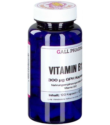 Wirkstoffe / Inhaltsstoffe / ZutatenVitamin B12 300 [my]g Gph Kapseln enthält: Füllstoff: Mannit (Kann bei übermäßigem Verzehr abführend wirken !) Kapselhülle: Gelatine Farbstoff in der Kapselhülle: Titandioxid Methylcobalamin (< 0,1 %) Zusammensetzung pro Tagesdosis (1 Kapsel): Vitamin B12 300 µg (12000 %*) *% der empfohlenen Tageszufuhr GegenanzeigenBei bekannter Überempfindlichkeit gegenüber einem der oben genannten Inhaltsstoffe sollte dieses Produkt nicht angewendet werden. DosierungAnwendungsempfehlung von Vitamin B12 300 [my]g Gph Kapseln: täglich 1 Kapsel unzerkaut mit ausreichend Flüssigkeit einnehmen.HinweiseNahrungsergänzungsmittel sind kein Ersatz für eine gesunde und ausgewogene Ernährung und sollten außerhalb der Reichweite von Kindern aufbewahrt werden. Die angegebene empfohlene Verzehrmenge darf nicht überschritten werden. Vitamin B12 300 [my]g Gph Kapseln können in Ihrer Versandapotheke www.juvalis.de erworben werden. ...