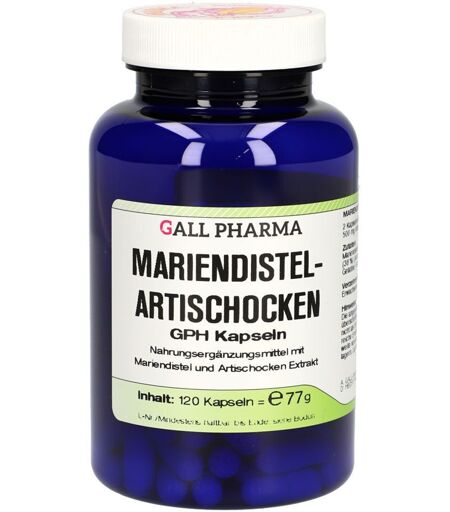 Nahrungsergänzungsmittel sind kein Ersatz für eine ausgewogene und abwechslungsreiche Ernährung als Teil eines aktiven und gesunden Lebensstils.GALL PHARMA Mariendistel-Artischoken GPH Kapseln ?Die Mariendistel (Silybum marianum) auch Frauendistel oder Marienkörner genannt, enthält die Stoffe Silymarin, Flavonoide, ätherische Öle und Harze. Silymarin ist ausschließlich in den Früchten enthalten und schützt die Leber, stärkt und entgiftet diese. Die Artischocke enthält vor allem Cynarin und kann bei Verdauungsbeschwerden eingenommen werden.Diese Kombination übt folgende Funktionen aus:Leberschutzwirkung: Die Leber ist das zentrale Stoffwechselorgan des menschlichen Organismus und dementsprechend diversen schädigenden Einflüssen wie Alkohol, Arzneimittel oder Umwelteinflüsse ausgesetzt. Silymarin stimuliert die Neubildung von den Leberzellen und fördert somit dieRegenerationskräfte der Leber.Verdauungstrakt: Da Silymarin die Regenerationsfähigkeit der Leber fördert und so die für die Verdauung wichtige Gallenflüssigkeit gebildet werden kann, regt die Mariendistel auch die Verdauung an. Cynarin aus der Artischocke regt den Stoffwechsel von Leber und Galle an.Cholesterinspiegel: Die Inhaltsstoffe der Artischocke, vor allem Cynarin, unterstützen die Aufrechterhaltung eines normalen Cholesterinspiegels im Blut.Radikalfänger: Silymarin schützt die Zelle außerdem vor freien Radikalen. Unsere heutigen Lebensumstände – hohe körperliche und psychische Belastungen, unausgewogene Ernährung sowie negative Umwelteinflüsse – fördern die Entstehung freier Radikale. Sie schädigen die Zellen und sind damit an der Entstehung vieler Krankheiten beteiligt. Silymarin kann freie Radikale unschädlich machen.Ernährungsfehler, Erkrankungen der Leber und übermäßiger Alkoholkonsum können die Funktion der Leber beeinträchtigen. Eine tägliche Zufuhr von Artischocke und Mariendistel Extrakt ergänzt in diesen Fällen die Ernährung sinnvoll. Bei Völlegefühl, Blähungen und anderen Verdauungstörungen können Artischocke + Mariendistel Kapseln unterstützend eingenommen werden.Zutaten:Mariendistelsamen Extrakt (46 %), Artischockenblätter Extrakt (38 %) (Artischockenblätter Extrakt, Maltodextrin); Kapselhülle: Gelatine; Farbstoff in der Kapselhülle: Verzehrempfehlung:Erwachsene 2 x 1 Kapslel täglich mit Flüssigkeit einnehmen.Hinweis:Die angegebene empfohlene tägliche Verzehrmenge darf nicht überschritten werden.Aufbewahrung:Kühl (6-25 °C) und lichtgeschützt lagern. Außerhalb der Reichweite von kleinen Kindern aufbewahren.Nettofüllmenge:120 KapselnHersteller:HECHT PHARMA GmbHD-27432 Bremervörde ...