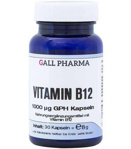 Nahrungsergänzungsmittel sind kein Ersatz für eine ausgewogene und abwechslungsreiche Ernährung und eine gesunde Lebensweise.Vitamin B12 1000µg GPH KapselnNahrungsergänzungsmittel mit Vitamin B12Zutaten:?Füllstoff: Mannit (Kann bei übermäßigem Verzehr abführend wirken!); Kapselhülle: Ceilulose; Farbstoff in der Kapselhülle ; Trennmittel: Magnesiumsalze von Speisefettsäuren; Methylcobalamin (0,36 %)Nährwertangaben:1 Kapsel enthält 1000 µg Vitamin B12 ensprechend 40000 % NRV**NRV - Prozent der empfohlenen TagesdosisVerzehrempfehlung:?Erwachsene 1 x 1 Kapsel täglichHinweise:?Die angegebene empfohlene Verzehrempfehlung sollte nicht überschritten werden Nahrungsergänzungsmittel dürfen nicht als Ersatz für eine ausgewogene und abwechslungsreiche Ernährung verwendet werden.Glutenfrei. Lactosefrei. Hefefrei.Aufbewahrung:? Außerhalb der Reichweite von kleinen Kindern bei Raumtemperatur trocken lagern.Nettofüllmenge:30 Kapseln = 8 gHerstellerdaten:?GALL-Pharma GmbH8750 Judenburg ...