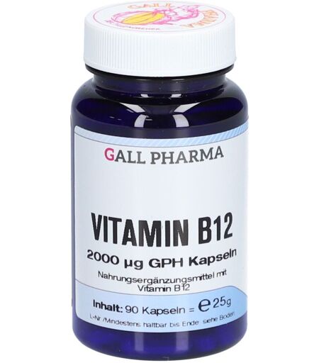 Nahrungsergänzungsmittel sind kein Ersatz für eine ausgewogene und abwechslungsreiche Ernährung und eine gesunde Lebensweise.GALL PHARMA VITAMIN B12 2000 µg GPH KapselnIn den Vitamin B12 2000 µg GPH Kapseln wird die natürlich B12-Form Methylcobalamin“ verwendet. Diese kommt auch in vielen Nahrungsmitteln vor, besonders in Milch und Käse. Vitamin B12 kann im Körper gespeichert werden. So kann er darauf immer wieder zurückgreifen. Allerdings kann es durch verschiedene Lebensumstände vorkommen, dass er nicht genügend davon aufnehmen kann. Gerade Veganer, die keine tierischen Produkte zu sich nehmen, fehlt es daher oft an dieser Quelle.Vitamin B12 trägt zu einem normalen Energiestoffwechsel beiVitamin B12 trägt zu einer normalen Funktion des Nervensystems beiVitamin B12 trägt zu einer normalen Funktion des Immunsystems beiVitamin B12 trägt zur Verringerung von Müdigkeit und Ermüdung beiZutaten:Füllstoff: Mannit (Kann bei übermäßigem Verzehr abführend wirken!); Methylcobalamin; Trennmittel: Magnesiumsalze der SpeisefettsäurenKapselhülle: Cellulose; Farbstoff in der Kapselhülle: CalciumcarbonatNährwertangaben:NährwertangabenInhaltsstoffPro 1 Kapsel*NRV (1 Kapsel)Vitamin B122000 µg80.000 %*NRV = Prozent der empfohlenen TagesdosisVerzehrsempfehlung:Erwachsene: 1 x 1 Kapsel täglich mit Flüssigkeit einnehmen.Aufbewahrungs- & Verwendungshinweis:Die angegebene empfohlene Verzehrempfehlung darf nicht überschritten werden. Nahrungsergänzungsmittel dürfen nicht als Ersatz für eine ausgewogene und abwechslungsreiche Ernährung verwendet werden. Außerhalb der Reichweite von kleinen Kindern bei Raumtemperatur lagern. Nettofüllmenge:90 Kapseln Hestellerdaten:Hechtpharma ...