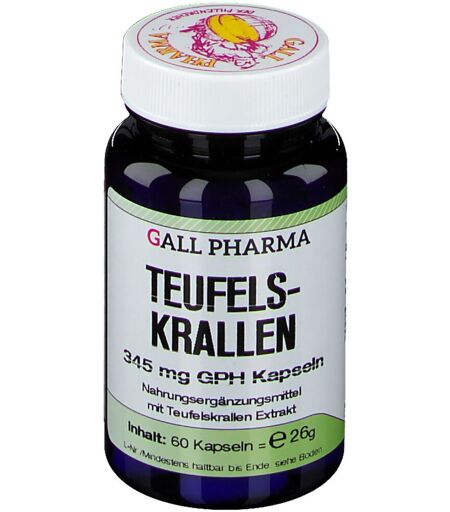 Nahrungsergänzungsmittel sind kein Ersatz für eine ausgewogene und abwechslungsreiche Ernährung und eine gesunde Lebensweise.Die Teufelskralle gehört zur Familie der Glockenblumengewächse (Campanulaceae) und wird für ihre entzündungshemmenden, schmerzlindernden und appetitanregenden Eigenschaften geschätzt.Die Pflanze weist einen positiven Effekt bei degenerativen Gelenksbeschwerden, Gelenksentzündungen und Arthritis auf. Zudem hat sie günstigen Einfluss auf den Verdauungstrakt.Durch den bitteren Geschmack der Teufelskralle werden der Speichelfluss und die Produktion der Verdauungssäfte angeregt. Unterstützen bei Beschwerden der Gelenke Fördern die Verdauung Regen den Appetit anZutaten:Teufelskrallen Extrakt; Füllstoff: Mannit (Kann bei übermäßigem Verzehr abführend wirken!)Kapselhülle: Gelatine; Farbstoff in der Kapselhülle: Nährwerte:1 Kapsel enthält 345 mg Teufelskrallen Extrakt.Verzehrempfehlung:Erwachsene: 3 x 1 Kapsel täglich mit Flüssigkeit einnehmen.HinweiseDie angegebene empfohlene Verzehrempfehlung sollte nicht überschritten werden.LagerungAußerhalb der Reichweite von kleinen Kindern lagern.Bei Raumtemperatur lagern.Nettofüllmenge 60 Kapseln = 26 g HerstellerGALL-Pharma GmbHGrünhüblgasse 25A-8750 Judenburg ...