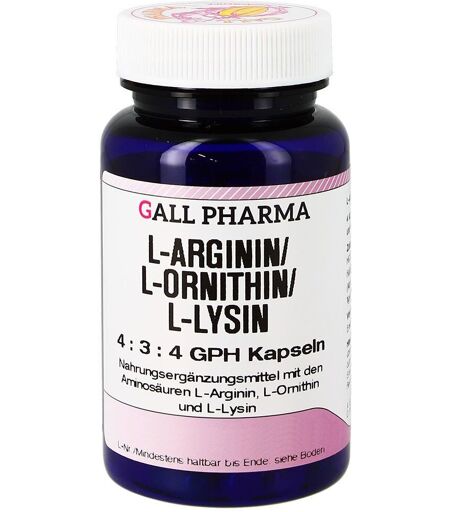 Nahrungsergänzungsmittel sind kein Ersatz für eine ausgewogene und abwechslungsreiche Ernährung und eine gesunde Lebensweise.GALL PHARMA L-Arginin/L-Ornithin/L-Lysin 4:3:4 GPHZutaten: L-Lysin HCl (25 %), L-Arginin (20 %), L-Ornithin HCl (19 %); Füllstoff: Mannit (kann bei übermäßigem Verzehr abführend wirken); Kapselhülle: Gelatine; Farbstoffe in der Kapselhülle: , Eisenoxid, Ponceau 4 R, Chinolingelb (Kann Aktivität und Aufmerksamkeit bei Kindern beeinträchtigen!), Patentblau VVerzehrempfehlung: Erwachsene: 2 x 2 Kapseln täglich mit Flüssigkeit einnehmen. Hinweise: Glutenfrei. Lactosefrei. Aufbewahrung: Außerhalb der Reichweite von Kindern bei Raumtemperatur trocken lagern.Nettofüllmenge:180 St = 105 gHerstellerdaten: Gall-Pharma GmbH Grünhüblgasse 258750 Judenburg ...