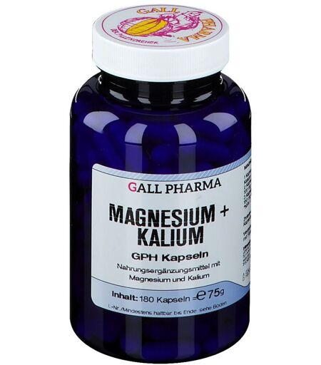 Nahrungsergänzungsmittel sind kein Ersatz für eine ausgewogene und abwechslungsreiche Ernährung und eine gesunde Lebensweise.GALL PHARMA Magnesium + Kalium GPH Kapseln Magnesium + Kalium GPH Kapseln enthalten 100 mg reines Magnesium in Form von Magnesiumoxid und Magnesiumcitrat und zusätzlich 50 mg reines Kalium in Form von Kaliumchlorid in einer Hartgelatinekapsel. Magnesium + Kalium GPH bios Kapseln sind ein Qualitätsprodukt mit hochwertigen Rohstoffen. Bei der Produktion werden keine Farbstoffe und Konservierungsmittel eingesetzt. Die in den Hartgelatinekapseln verwendete Gelatine ist BSE/TSE-geprüfte Pharmagelatine. Zutaten: Magnesiumoxid, Kaliumchlorid; Magnesiumcitrat Kapselhülle: CelluloseAllergene:Glutenfrei. Lactosefrei.Nährwerte:1 Kapsel enthält 100 mg Magnesium (26 % NRV*) und 50 mg Kalium (2,5 % NRV*).2 Kapseln enthalten 200 mg Magnesium (53 % NRV*) und 100 mg Kalium (5 % NRV*).3 Kapseln enthalten 300 mg Magnesium (80 % NRV*) und 150 mg Kalium (7,5 % NRV*).*NRV = Prozent der empfohlenen TagesdosisVerzehrempfehlung: Erwachsene: 1 – 3 x 1 Kapsel täglich mit Flüssigkeit einnehmen.Hinweis:Die angegebene empfohlene Tagesmenge darf nicht überschritten werden.Aufbewahrung: Kühl (6-25 °C) und lichtgeschützt lagern. Außerhalb der Reichweite von kleinen Kindern aufbewahren.Nettofüllmenge:180 St = 75 gHerstellerdaten: Gall-Pharma GmbH Grünhüblgasse 258750 Judenburg ...