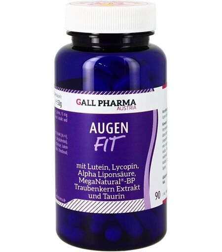 Nahrungsergänzungsmittel sind kein Ersatz für eine abwechslungsreiche und ausgewogene Ernährung und gesunde Lebensweise.GALL PHARMA Augen-Fit GPH KapselnDie enthaltene Alpha-Liponsäure kann einen positiven Einfluss auf die Funktion der Augen bzw. des Augengewebes sowie der Linse und Retina haben und ebenso die Leistungsfähigkeit des Gehirns steigern. Das enthaltene Lutein ist als Helfer bei altersbedingter Macula-Degeneration bekannt und kann auch im hohen Alter noch einer Macula-Degeneration vorbeugen und auch diese abmildern. Lycopin gehört zur Klasse der Carotinoide und kommt speziell in Tomaten in hohen Konzentrationen vor. Es zählt zu den Antioxidantien und gilt als Radikalfänger, d.h. es kann bestimmte reaktionsfreudige Moleküle im menschlichen Körper unschädlich machen. Durch die Kombination mit Fett wird die Resorptionsrate (d.h. die Aufnahme in die Blutbahn) erhöht. Traubenkernextrakt ist eine natürliche Quelle für das Antioxidans OPC. Oligomere Proanthocyanidine schützen das Auge vor ultravioletten Strahlen. Taurin ist ebenso ein stark wirksames Antioxidantien, welches das Auge vor Zellschädigungen durch freie Radikale schützen soll.Diese Nährstoffkombination aus starken Antioxidantien sorgt für die Gesunderhaltung des Auges, d.h. sie schützt das Auge vor Zellschädigungen durch freie Radikale. Zudem kann durch die Zusammensetzung oben genannter Inhaltsstoffe einer altersbedingten Macula-Degeneration vorgebeugt und diese auch abgemildert werden.Rohstoffbeschreibung: Razemische Alpha-Liponsäure wird synthetisch hergestellt und ist frei von Lösungsmitteln. Lutein wird in Form von Luteinester zugefügt. Dies ist ein hochwertiger Rohstoff natürlichen Ursprungs. Luteinester stellt die Vorstufe von Lutein dar. Das 5 %ige Lycopinpulver wird aus Tomaten gewonnen. Die oligomeren Proanthocyanidine werden in Form von MegaNatural®-BP Traubenkern Extrakt eingesetzt. Die Stammpflanze ist Vitis vinifera. Der Extrakt ist standardisiert auf Phenole und OPC. MegaNatural®-BP ist ein eingetragenes Markenzeichen der Firma Polyphenolics. Taurin ist nicht tierischen Ursprungs und wird durch chemische Synthese hergestellt. Die in den Hartgelatinekapseln verwendete Gelatine ist BSE/TSE-geprüfte Pharmagelatine.Zutaten: Taurin (16 %), MegaNatural-BP Traubenkern Extrakt (16 %), Lycopin (16 %) (Lycopin, Alginat, arabisches Gummi, Amylodextrin), Luteinester (16 %) (Lactose Monohydrat, Dextrin, Saccharose, Lutein Ester); Kapselhülle: Gelatine; Farbstoff in der Kapselhülle: ; Füllstoff: Mannit; Alpha Liponsäure (8 %)Verzehrempfehlung: Erwachsene: bis zu 3 x 1 Kapsel täglich mit Flüssigkeit einnehmen.Hinweis: Die angegebene empfohlene tägliche Verzehrmenge darf nicht überschritten werden. Enthält Lactose und Soja Aufbewahrung: Kühl (6-25 °C) und lichtgeschützt lagern. Außerhalb der Reichweite von kleinen Kindern aufbewahren.Nettofüllmenge: 90 Kapseln = 53 g 180 Kapseln = 107 g Herstellerdaten: HECHT Pharma GmbH Zevener Straße 9 27432 Bremervörde Deutschland ...
