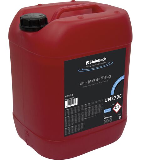 Steinbach Pool Professional pH Minus flüssig 20 kg Produktnummer: 0691452331 Flüssiges Säurekonzentrat zur pH-Wert-Senkung pH - (minus) flüssig, 20,00 kg, UN2796, Met. Corr. 1, Skin Irrit. 2, Eye Irrit. 2 ANWENDUNG: Wasserpflegemittel. Flüssiger pH-Senker für Schwimmbadwasser. Enthält keine Salzsäure. Der optimale pH-Wert im Schwimmbecken liegt zwischen 7,0 und 7,4. Wir empfehlen, den pH-Wert mindestens 1x wöchentlich mittels Teststreifen oder Tabletten zu überprüfen und ggf. zu korrigieren. Ausschließlich für Privatschwimmbäder. DOSIERUNG: Zur Senkung des pH-Werts um 0,1 ca. 350 bis 420 ml pH - (minus) flüssig/10 m³ Beckeninhalt zugeben. Der Verbrauch richtet sich nach dem gewünschten pH-Wert, der Härte des Wassers und den verwendeten Chlorprodukten. Die Dosierung kann über eine Dosierpumpe direkt aus dem Liefergebinde, per Hand oder über eine automatische Dosieranlage erfolgen. Bei Zugabe per Hand, pH - (minus) flüssig zuerst in einem Eimer mit Wasser verdünnen und anschließend langsam in das Wasser gießen. Halten Sie dabei ausreichend Abstand von Metallteilen. Inhalt: 20 kg flüssig flüssiges Mittel zum Senken des pH-Wertes für alle gängigen automatischen Dosieranlagen Voraussetzung für eine optimale Wirksamkeit von Desinfektionsmitteln ist ein korrekt eingestellter pH-Wert Herstellerinformationen: Steinbach International GmbH L. Steinbach Platz 1 4311 Schwertberg, Österreich Website: www.steinbach-goup.com Herstellernr. 07531A20PD00 Verbraucherhinweise Gefahrenhinweise Kann gegenüber Metallen korrosiv sein.Verursacht Hautreizungen.Verursacht schwere Augenreizung. Sicherheitshinweise BEI KONTAKT MIT DEN AUGEN: Einige Minuten lang behutsam mit Wasser spülen. Eventuell vorhandene Kontaktlinsen nach Möglichkeit entfernen. Weiter spülen.Ist ärztlicher Rat erforderlich, Verpackung oder Kennzeichnungsetikett bereithalten.Darf nicht in die Hände von Kindern gelangen.Nach Gebrauch die Hände gründlich waschen.Inhalt/Behälter der Problemabfallentsorgung zuführen.Schutzhandschuhe / Schutzkleidung / Augenschutz / Gesichtsschutz / Gehörschutz tragen.Ausgetretene Mengen auffangen. ...