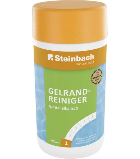 Steinbach Poolpflege Gelrandreiniger 1 L, Beckenreiniger Produktnummer: 0691451321 Gelrandreiniger spezial alkalisch, 1,00 l , Wirkungsvolle Reinigung aller im Schwimmbad befindlichen Materialien ANWENDUNG: Gelrandreiniger spezial alkalisch dient zur Grundreinigung im Frühjahr und beseitigt mühelos Schmutz-, Fett- und Rußränder im Schwimmbecken. Er kann für den Außen- und Innenbereich eingesetzt werden. Durch die dickflüssige Form bleibt der Reiniger leichter haften und kann somit länger seinen Wirkstoff entfalten. Alle gängigen und bekannten Teile im Schwimmbad dürfen damit behandelt werden. Nach Anwendung das Reinigungsmittel wieder gründlich entfernen. Ausschließlich für Privatschwimmbäder. DOSIERUNG: Mit einem Schwamm bzw. einer Bürste pur auftragen. Gel mindestens 10 Minuten einwirken lassen und mit Wasser abspülen. Wenn notwendig, starke Verkrustungen und Ablagerungen abbürsten. Für hartnäckige Flecken den Vorgang bitte wiederholen. Die gelartige Konsistenz erlaubt den Einsatz selbst bei vertikalen Wänden und überzeugt durch eine lange Haftung. Der Reiniger ist verdünnt im Schwimmbadwasser im Falle einer Aufnahme nicht giftig für Mensch und Tier. Nicht bei direkter Sonneneinstrahlung anwenden. 1 L Gelrandreiniger spezial alkalisch Wirkungsvolle Reinigung aller im Schwimmbad befindlichen Materialien Ausschließlich für Privatschwimmbäder. Herstellerinformationen: Steinbach International GmbH L. Steinbach Platz 1 4311 Schwertberg, Österreich Website: www.steinbach-goup.com Herstellernr. 0755101TD08 Verbraucherhinweise Gefahrenhinweise Verursacht schwere Augenschäden. Sicherheitshinweise Ist ärztlicher Rat erforderlich, Verpackung oder Kennzeichnungsetikett bereithalten.Darf nicht in die Hände von Kindern gelangen.Sofort GIFTINFORMATIONSZENTRUM/Arzt anrufen.Inhalt/Behälter der Problemabfallentsorgung zuführen.Schutzhandschuhe/Augenschutz tragen.BEI KONTAKT MIT DEN AUGEN: Einige Minuten lang behutsam mit Wasser spülen. Eventuell vorhande- ne Kontaktlinsen nach Möglichkeit entfernen. Weiter spülen. ...