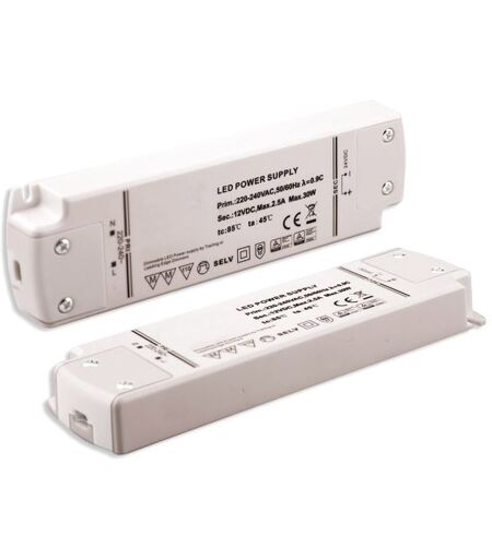 LED Flexband-Trafo 12V/DC, 0-30W, dimmbar (Spannungssenke), SELV: Länge: 157mm, Breite: 46mm, Höhe: 19mm, Nettogewicht: 140g, Nennspannung: 220-240V AC, Nennleistung: 30W, Schutzart: IP20, Dimmbar: Jadimmbar per TRIAC-Dimmaktor, empfohlen wird ein Phasenabschnittdimmer, Dimm-Output: Spannungssenke!, Material: PVC, weiss, Inkl. Leuchtmittel: Nein, Besonderheiten: Achtung: Nur für den Betrieb von 12V DC Flexbändern geeignet - nicht zum Betrieb von 12V AC/DC tauglichen Leuchtmitteln! ...