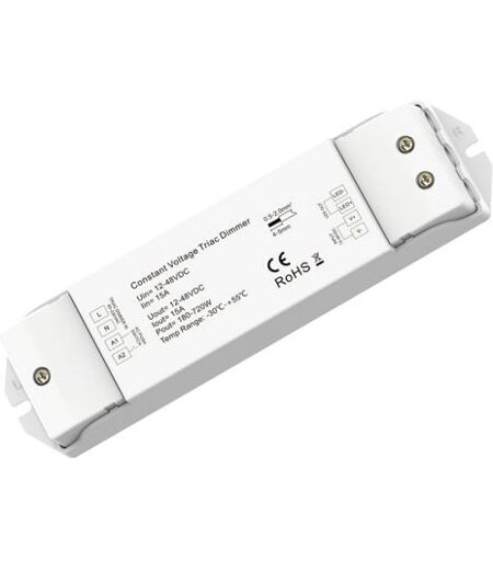 Phasenan-/Abschnitt (40-230V)/Push Eingangssignal zu PWM-Controller, 1 Kanal, 12-48V DC 15A: Nettogewicht: 106g, Nennspannung: 100-240V AC, Schutzart: IP20, Material: Kunststoff, Inkl. Leuchtmittel: Nein, Besonderheiten: Regelung durch eingehende 40-230V AC Sinuswellen modulierte Steuerpassnung via Phasenan- oder Abschnittdimmer, optional auch zusätzlicher Schließtaster anschließbar, PWM Ausgangsfrequenz 500Hz ...