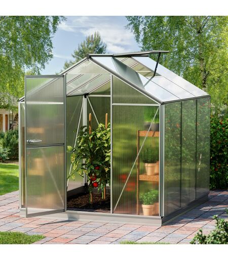 192 x 192 cm Gewächshaus, ohne Setangebot 6 mm: Sie sind Hobbygärtner und möchten mit einem praktischen Einstiegsmodell in die Welt der Selbstversorgung eintauchen? Kein Problem! Mit diesem Standard-Gewächshaus der Qualitätsmarke GFP in aluminium mit den Maßen 1,92x1,92m gelingt der Start kinderleicht. Dank der ca. 6 bis 8 mm starken und lichtdurchlässigen Doppelstegplatten aus Polycarbonat – "Made in Germany" – sowie der stabilen Aluminium-Konstruktion – "Designed in Austria" – überzeugt das Modell mit Stabilität, Funktionalität und einer guten Wärmedämmung. Es ist leicht zu montieren, weist eine Seitenhöhe von ca. 135 cm auf und bietet zudem eine zweckmäßige Einfachdrehtür und ein Dachfenster zur optimalen Belüftung. Profitieren Sie außerdem von einer 15-jährigen Garantie auf den Aluminium-Rahmen und einer 10-jährigen Garantie auf die Doppelstegplatten. Sie wollten schon immer einmal Ihr eigenes Obst und Gemüse anbauen? Sie möchten sich keine Gedanken mehr darüber machen, woher Ihre Lebensmittel stammen und ob diese bespritzt sind? Werden Sie zum Selbstversorger und pflanzen Sie Ihr eigenes, pestizidfreies und frisches Gemüse im Garten an – das 1,92x1,92m große Standard-Gewächshaus der Qualitätsmarke GFP ist für dieses Vorhaben das ideale Einstiegsmodell! Mit einer Grundfläche von ca. 3.6864m² eignet sich das ECO STAR-Gewächshaus hervorragend, um erste Erfahrungen mit dem Pflanzenanbau und der Ernte zu sammeln. Lichtdurchlässige Doppelstegplatten aus Polycarbonat lassen viel Sonnenlicht ins Gewächshaus eindringen und versorgen Ihre Pflanzen mit Wärme. Zusätzlich zeichnen sich die Platten durch ihre Robustheit, Langlebigkeit, guten Wärmedämmung und UV-Beständigkeit aus. Sie sind ca. 6 mm stark und ideal für den ganzjährigen Einsatz geeignet. Die Gewächshaus-Konstruktion besteht aus hochwertigem Aluminium mit stabilen Zink-Druckgussverbindern und ist korrosionsbeständig. Dadurch ist diese tragfähig, sehr verwindungssteif und ebenfalls für den ganzjährigen Einsatz konzipiert. Eine erstklassige Konstruktion, die Wind und Wetter trotzt! Integrierte Dachrinnen fangen zudem Regenwasser auf und Windverbände an allen Seiten dienen als Windschutz. Wichtige Aspekte, schließlich können Nässe und Feuchtigkeit das Wachstum Ihrer Pflanzen beeinträchtigen. Außerdem kann das durch die Dachrinne aufgefangene Regenwasser für die Bewässerung Ihres Obsts und Gemüses genutzt werden. Es handelt sich also um eine erstklassige, für den ganzjährigen Einsatz konzipierte Konstruktion, die Wind und Wetter trotzt! Die 1 Dachfenster inklusive praktischem Aufsteller gewährleisten einen ständigen Luftaustausch und sorgen so für eine ausreichende Sauerstoffversorgung Ihrer Pflanzen. Die leichtgängige Einfachdrehtür mit den Maßen 61x165 cm begünstigt ebenfalls die Sauerstoffversorgung. Die Tür wird über die ganze Höhe als Scharnier ausgeführt und ist dadurch stabil bei Wind und Wetter. Wie auch der Rest dies ECO Star-Gewächshauses, besteht die Tür aus hochwertigem... ...