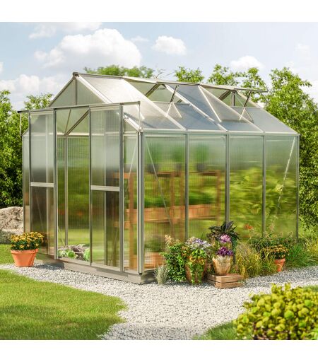 259 x 259 cm Gewächshaus, inkl. Aktionsset - XL 6 mm: Sie sind Hobbygärtner*in oder hegen den großen Traum von der Selbstversorgung? Mit diesem Hobby-Gewächshaus der Qualitätsmarke GFP in aluminium mit den Maßen 2,59x2,59m wird Ihr Wunsch zur Wirklichkeit! Die stabile Aluminium-Konstruktion – "Designed in Austria" – und die 6 bis 8 mm starken Doppelstegplatten aus Polycarbonat – "Made in Germany" – sorgen für einen witterungs-, wetter- sowie UV-beständigen Ganzjahreseinsatz. Dank der leichtgängigen, praktischen Doppelschiebetür und – je nach Modell – 1 bis 4 Dachfenstern ist für ausreichend Frischluftzufuhr gesorgt. Mit einem Gewicht von 6 mm, einer Breite von [product_width] und einer Höhe von 2,18 gilt das moderne Gewächshaus als robust. Profitieren Sie zudem von 15 Jahren Garantie auf den Aluminium-Rahmen und 10 Jahren Garantie auf die Doppelstegplatten. Sie sind Hobbygärtner oder möchten es gerne einmal werden? Dann darf dieses 2,59x2,59m große Hobby-Gewächshaus der Qualitätsmarke GFP nicht in Ihrem Garten fehlen! Mit einer Traufenhöhe von ca. [size_height_side] und einer Grundfläche von ca. 6.7081m² bietet dieses freistehende Gewächshaus ausreichend Platz für den Anbau Ihrer Pflanzen! Werden Sie zum Selbstversorger und pflanzen Sie Ihr eigenes Obst und Gemüse – und das, frei von Pestiziden und Giftstoffen! Das Hobby-Gewächshaus ist aber nicht nur das ideale Produkt zum Anbau und Ernten und somit für den Beginn eines neuen, nährstoffreichen Lebensstils, sondern es bietet Ihren Pflanzen ein wetterfestes Dach. Lichtdurchlässige Doppelstegplatten aus Polycarbonat lassen viel Sonnenlicht ins Gewächshaus eindringen und versorgen Ihre Pflanzen mit Wärme. Zusätzlich zeichnen sich die Platten durch ihre Robustheit, Langlebigkeit, guten Wärmedämmung und UV-Beständigkeit aus. Sie sind ca. 6 mm stark und ideal für den ganzjährigen Einsatz geeignet. Außerdem ist dieses Gewächshaus mit einer besonders stabilen Konstruktion ausgestattet. Diese besteht aus Aluminium und ist korrosionsbeständig. Das Firstprofil ist als Hohlkammerprofil ausgeformt und somit verwindungssteif und tragfähig zugleich. Dank der Verschraubung der First- und Dachecken via hochwertigen Zink-Druckgussverbindern können diese Wind- und Schneelasten effektiv aufnehmen. Die Hohlkammerprofile der Seiteneck- und Dacheckprofile sowie die Eckverbinder aus Zink-Druckguss sorgen zusätzlich für eine ausgezeichnete Stabilität. Integrierte Dachrinnen fangen zudem Regenwasser auf und Windverbände an allen Seiten dienen als Windschutz. Wichtige Aspekte, schließlich können Nässe und Feuchtigkeit das Wachstum Ihrer Pflanzen beeinträchtigen. Außerdem kann das durch die Dachrinne aufgefangene Regenwasser für die Bewässerung Ihres Obsts und Gemüses genutzt werden. Es handelt sich also um eine erstklassige, für den ganzjährigen Einsatz konzipierte Konstruktion, die Wind und Wetter trotzt! Die 2 Dachfenster inklusive praktischem Aufsteller gewährleisten einen ständigen Luftaustausch und sorgen so für... ...