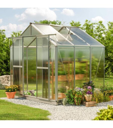 259 x 195 cm Gewächshaus, ohne Setangebot 8 mm: Sie sind Hobbygärtner*in oder hegen den großen Traum von der Selbstversorgung? Mit diesem Hobby-Gewächshaus der Qualitätsmarke GFP in aluminium mit den Maßen 2,59x1,95m wird Ihr Wunsch zur Wirklichkeit! Die stabile Aluminium-Konstruktion – "Designed in Austria" – und die 6 bis 8 mm starken Doppelstegplatten aus Polycarbonat – "Made in Germany" – sorgen für einen witterungs-, wetter- sowie UV-beständigen Ganzjahreseinsatz. Dank der leichtgängigen, praktischen Doppelschiebetür und – je nach Modell – 1 bis 4 Dachfenstern ist für ausreichend Frischluftzufuhr gesorgt. Mit einem Gewicht von 8 mm, einer Breite von [product_width] und einer Höhe von 2,18 gilt das moderne Gewächshaus als robust. Profitieren Sie zudem von 15 Jahren Garantie auf den Aluminium-Rahmen und 10 Jahren Garantie auf die Doppelstegplatten. Sie sind Hobbygärtner oder möchten es gerne einmal werden? Dann darf dieses 2,59x1,95m große Hobby-Gewächshaus der Qualitätsmarke GFP nicht in Ihrem Garten fehlen! Mit einer Traufenhöhe von ca. [size_height_side] und einer Grundfläche von ca. 5.0505m² bietet dieses freistehende Gewächshaus ausreichend Platz für den Anbau Ihrer Pflanzen! Werden Sie zum Selbstversorger und pflanzen Sie Ihr eigenes Obst und Gemüse – und das, frei von Pestiziden und Giftstoffen! Das Hobby-Gewächshaus ist aber nicht nur das ideale Produkt zum Anbau und Ernten und somit für den Beginn eines neuen, nährstoffreichen Lebensstils, sondern es bietet Ihren Pflanzen ein wetterfestes Dach. Lichtdurchlässige Doppelstegplatten aus Polycarbonat lassen viel Sonnenlicht ins Gewächshaus eindringen und versorgen Ihre Pflanzen mit Wärme. Zusätzlich zeichnen sich die Platten durch ihre Robustheit, Langlebigkeit, guten Wärmedämmung und UV-Beständigkeit aus. Sie sind ca. 8 mm stark und ideal für den ganzjährigen Einsatz geeignet. Außerdem ist dieses Gewächshaus mit einer besonders stabilen Konstruktion ausgestattet. Diese besteht aus Aluminium und ist korrosionsbeständig. Das Firstprofil ist als Hohlkammerprofil ausgeformt und somit verwindungssteif und tragfähig zugleich. Dank der Verschraubung der First- und Dachecken via hochwertigen Zink-Druckgussverbindern können diese Wind- und Schneelasten effektiv aufnehmen. Die Hohlkammerprofile der Seiteneck- und Dacheckprofile sowie die Eckverbinder aus Zink-Druckguss sorgen zusätzlich für eine ausgezeichnete Stabilität. Integrierte Dachrinnen fangen zudem Regenwasser auf und Windverbände an allen Seiten dienen als Windschutz. Wichtige Aspekte, schließlich können Nässe und Feuchtigkeit das Wachstum Ihrer Pflanzen beeinträchtigen. Außerdem kann das durch die Dachrinne aufgefangene Regenwasser für die Bewässerung Ihres Obsts und Gemüses genutzt werden. Es handelt sich also um eine erstklassige, für den ganzjährigen Einsatz konzipierte Konstruktion, die Wind und Wetter trotzt! Die 1 Dachfenster inklusive praktischem Aufsteller gewährleisten einen ständigen Luftaustausch und sorgen so für eine... ...