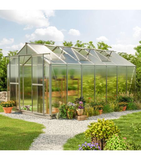 259 x 449 cm Gewächshaus, ohne Setangebot 8 mm: Sie sind Hobbygärtner*in oder hegen den großen Traum von der Selbstversorgung? Mit diesem Hobby-Gewächshaus der Qualitätsmarke GFP in aluminium mit den Maßen 2,59x4,49m wird Ihr Wunsch zur Wirklichkeit! Die stabile Aluminium-Konstruktion – "Designed in Austria" – und die 6 bis 8 mm starken Doppelstegplatten aus Polycarbonat – "Made in Germany" – sorgen für einen witterungs-, wetter- sowie UV-beständigen Ganzjahreseinsatz. Dank der leichtgängigen, praktischen Doppelschiebetür und – je nach Modell – 1 bis 4 Dachfenstern ist für ausreichend Frischluftzufuhr gesorgt. Mit einem Gewicht von 8 mm, einer Breite von [product_width] und einer Höhe von 2,18 gilt das moderne Gewächshaus als robust. Profitieren Sie zudem von 15 Jahren Garantie auf den Aluminium-Rahmen und 10 Jahren Garantie auf die Doppelstegplatten. Sie sind Hobbygärtner oder möchten es gerne einmal werden? Dann darf dieses 2,59x4,49m große Hobby-Gewächshaus der Qualitätsmarke GFP nicht in Ihrem Garten fehlen! Mit einer Traufenhöhe von ca. [size_height_side] und einer Grundfläche von ca. 11.6291m² bietet dieses freistehende Gewächshaus ausreichend Platz für den Anbau Ihrer Pflanzen! Werden Sie zum Selbstversorger und pflanzen Sie Ihr eigenes Obst und Gemüse – und das, frei von Pestiziden und Giftstoffen! Das Hobby-Gewächshaus ist aber nicht nur das ideale Produkt zum Anbau und Ernten und somit für den Beginn eines neuen, nährstoffreichen Lebensstils, sondern es bietet Ihren Pflanzen ein wetterfestes Dach. Lichtdurchlässige Doppelstegplatten aus Polycarbonat lassen viel Sonnenlicht ins Gewächshaus eindringen und versorgen Ihre Pflanzen mit Wärme. Zusätzlich zeichnen sich die Platten durch ihre Robustheit, Langlebigkeit, guten Wärmedämmung und UV-Beständigkeit aus. Sie sind ca. 8 mm stark und ideal für den ganzjährigen Einsatz geeignet. Außerdem ist dieses Gewächshaus mit einer besonders stabilen Konstruktion ausgestattet. Diese besteht aus Aluminium und ist korrosionsbeständig. Das Firstprofil ist als Hohlkammerprofil ausgeformt und somit verwindungssteif und tragfähig zugleich. Dank der Verschraubung der First- und Dachecken via hochwertigen Zink-Druckgussverbindern können diese Wind- und Schneelasten effektiv aufnehmen. Die Hohlkammerprofile der Seiteneck- und Dacheckprofile sowie die Eckverbinder aus Zink-Druckguss sorgen zusätzlich für eine ausgezeichnete Stabilität. Integrierte Dachrinnen fangen zudem Regenwasser auf und Windverbände an allen Seiten dienen als Windschutz. Wichtige Aspekte, schließlich können Nässe und Feuchtigkeit das Wachstum Ihrer Pflanzen beeinträchtigen. Außerdem kann das durch die Dachrinne aufgefangene Regenwasser für die Bewässerung Ihres Obsts und Gemüses genutzt werden. Es handelt sich also um eine erstklassige, für den ganzjährigen Einsatz konzipierte Konstruktion, die Wind und Wetter trotzt! Die 3 Dachfenster inklusive praktischem Aufsteller gewährleisten einen ständigen Luftaustausch und sorgen so für eine... ...