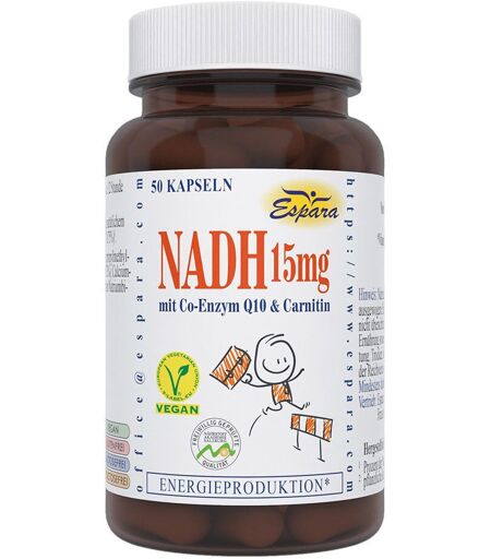 Nahrungsergänzungsmittel sind kein Ersatz für eine abwechslungsreiche und ausgewogene Ernährung und eine gesunde Lebensweise.NADH-15mg KapselnNahrungsergänzungsmittel mit hochdosiertem NADH (Co-Enzym 1), Vitamin C, Q10 und Carnitin. Vitamin C trägt zum normalen Energiestoffwechsel bei. Die pflanzliche Kapselhülle DRCAPSTM sorgt für eine verzögerte Freisetzung und schützt so das NADH vor der Magensäure. Vegan Glutenfrei Lactosefrei FructosefreiZutaten: Füllstoff Erbsenfasern, DRCAPSTM (Hydroxypropylmethylcellulose, Geliermittel Gellan), L-Carnitintartrat (19,23%), Calcium-Ascorbat-Dihydrat (5,13%), NADH (4,1%), Stabilisator Natriumbicarbonat, Co-Enzym Q10 (2,56%). *pflanzliche KapselhülleNährwerte: Durchschnittliche Nährwerte: pro 1 Kapsel % NRV* NADH 15 mg nat. Co-Enzym Q10 10 mg Carnitin 50 mg Vitamin C 16,6 mg 20,75 % Verzehrempfehlung:Morgens 1 Kapsel mit viel Flüssigkeit verzehren (ca. ½ Stunde vor dem Essen).Hinweis:Die angegebene empfohlene tägliche Verzehrmenge darf nicht überschritten werden.Aufbewahrungshinsweis:Kühl (6-25 °C), trocken und lichtgeschützt lagern. Außerhalb der Reichweite von kleinen Kindern aufbewahren.Nettofüllmenge:50 Kapseln = 19,0 g (Füllmenge)Hersteller:Espara GmbHFranz-Sauer-Straße 46-505020 Salzburg - Österreich ...