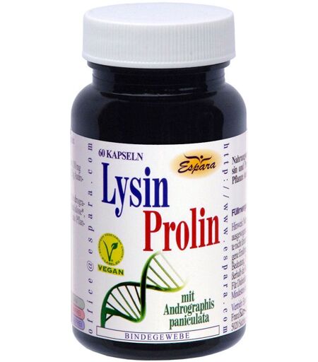 Nahrungsergänzungsmittel sind kein Ersatz für eine ausgewogene und abwechslungsreiche Ernährung und eine gesunde Lebensweise.Nahrungsergänzungsmittel mit den Aminosäuren Lysin und Prolin in Kombination mit der asiatischen Pflanze Andrographis paniculata.Zutaten:L-Lysin-Monohydrochlorid (36,66%), Andrographiskraut-Extrakt (Andrographiskraut-Extrakt, Trägerstoff Maltodextrin) (29,33%), Hydroxypropylmethylcellulose*, L-Prolin (14,66%), mittelkettige Triglyceride aus Kokos.*pflanzliche KapselhülleNährwerte: Tagesdosis (2 Kapseln) entspricht: L-Lysin 300 mg L-Prolin 150 mg Andrographiskraut-Extrakt 300 mg (15 mg Andrographolide) Verzehrempfehlung:2 x täglich 1 Kapsel mit Flüssigkeit verzehren.(Hinweis: für Diabetiker geeignet; 1 Kapsel: 0,003 BE)Hinweise: Die angegebene empfohlene tägliche Verzehrmenge darf nicht überschritten werden.Aufbewahrungshinweis:Trocken und nicht über Raumtemperatur lagern. Außerhalb der Reichweite von Kinder aufbewahren.Nettofüllmenge:60 Kapseln = 30,6 gHersteller:Espara GmbHFranz-Sauer-Straße 46-505020 Salzburg - Österreich ...