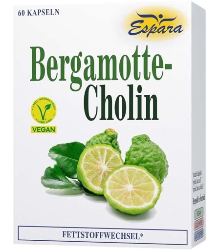 Nahrungsergänzungsmittel sind kein Ersatz für eine ausgewogene und abwechslungsreiche Ernährung und eine gesunde Lebensweise.Espara Bergamotte-Cholin KapselnNahrungsergänzungsmittel mit Cholin und Bergamotte-Extrakt (Bergavit®, aus kalabrischer Bergamotte) für ein gesundes Gefäßsystem. Cholin trägt zu einem normalen Fett- und Homocysteinstoffwechsel bei. Unterstützt den Fettstoffwechsel Trägt zum Homocysteinstoffwechsel bei Enthält Bergamotte-Extrakt Vegan, glutenfrei, lactosefreiZutaten:Bergamottefrucht-Extrakt (Bergavit®) (Bergamottefrucht-Extrakt, Trägerstoff Maltodextrin) (38,25%), Hydroxypropylmethylcellulose*, Füllstoff mikrokristalline Cellulose, Cholinbitartrat (15,85%), mittelkettige Triglyceride aus Kokos.*pflanzliche Kapselhülle Nährwertangaben pro Tagesdosis (4 Kapseln) Bergamottefrucht-Extrakt 600 mg Cholin 90 mg Verzehrempfehlung: 1-mal täglich 4 Kapseln mit Flüssigkeit einnehmen.Hinweis: Die angegebene empfohlene Tagesmenge darf nicht überschritten werden. Nahrungsergänzungsmittel stellen keinen Ersatz für eine ausgewogene Ernährung dar und die empfohlene Tagesdosis sollte nicht überschritten werden. Abwechslungsreiche und ausgewogene Ernährung sowie eine gesunde Lebensweise sind von großer Bedeutung.Aufbewahrung:Trocken, bei Raumtemperatur, lichtgeschützt sowie außerhalb der Reichweite von kleinen Kindern lagern. Vor Wärme schützen.Nettofüllmenge: 60 Kapseln ℮ 23,5 gHerstellerdaten: Espara GmbHFranz-Sauer-Straße 46 – Haus A 5020 Salzburg Österreich ...