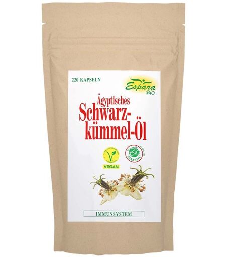 Nahrungsergänzungsmittel sind kein Ersatz für eine abwechslungsreiche und ausgewogene Ernährung und eine gesunde Lebensweise.Nahrungsergänzungsmittel mit ägyptischem Schwarzkümmel-Öl aus biologischem Anbau. Dieses enthält mehrfach ungesättigte Fettsäuren, die für den Stoffwechsel und das Immunsystem sehr wertvoll sind. Zutaten: Schwarzkümmel-Öl* (84,03%), Hydroxypropylmethylcellulose**. *aus kontrolliert biologischem Anbau **pflanzliche Kapselhülle Nährwerte: Tagesdosis (4 Kapseln) entspricht: Schwarzkümmel-Öl 2000 mg Verzehrempfehlung: 2 mal täglich 2 Kapseln mit Flüssigkeit zur Mahlzeit verzehren verzehren. Hinweis: Die angegebene empfohlene tägliche Verzehrmenge darf nicht überschritten werden. Aufbewahrungshinweis: Trocken und nicht über Raumtemperatur lagern. Außerhalb der Reichweite von Kinder aufbewahren.Nettofüllmenge: 70 Kapsel = 41,0 g Hersteller:Espara GmbHFranz-Sauer-Straße 46-505020 Salzburg - Österreich ...