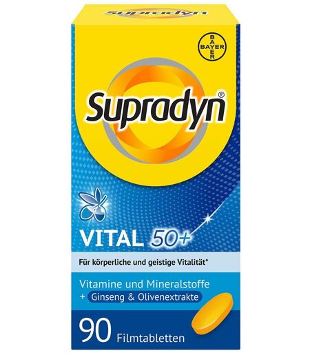 Nahrungsergänzungsmittel sind kein Ersatz für eine ausgewogene und abwechslungsreiche Ernährung und eine gesunde Lebensweise. Damit Alter keine Rolle spielt! Supradyn Vital 50+ ist ein Multivitaminpräparat für körperliche und geistige Vitalität*. Die leicht zu schluckenden Tabletten enthalten eine spezielle Kombination aus 12 Vitaminen, 9 Mineralstoffen sowie hochwertigen Extrakten aus der Olive und Ginseng, für ein aktives Leben unabhängig vom Alter. Der Vitamin-B-Komplex (B1, B6, B12, Niacin) unterstützt den Energiestoffwechsel und hilft bei der Energiefreisetzung aus der Ernährung. Die Vitamine C und D unterstützen das Immunsystem. Vitamin D trägt außerdem zur Erhaltung der Zähne, Knochen und Muskelfunktion bei. Darüber hinaus enthält Supradyn Vital 50+ zum Schutz der Zellen vor oxidativem Stress viele Antioxidantien wie Zink, Selen und Olivenextrakte.* Die Vitamine B1, B6, B12, Niacin, Vitamin C, sowie Kupfer und Mangan tragen zu einem normalen Energiestoffwechsel bei. Zink, Eisen und Jod tragen zu einer normalen kognitiven Funktion bei. Vitamin C, Vitamin D und Zink tragen zu einer normalen Funktion des Immunsystems bei. Zink trägt dazu bei, die Zellen vor oxidativem Stress zu schützen. Vitamin D trägt zur Erhaltung normaler Zähne und Knochen sowie einer normalen Muskelfunktion bei. Multivitaminpräparat mit spezieller Formel für körperliche und geistige Vitalität* –unabhängig vom Alter. Enthält 12 Vitamine und 9 Mineralstoffe für ein aktives Leben. Vitamine B1, B6, B12, Niacin, Vitamin C sowie Kupfer und Mangan tragen zum Energiestoffwechsel bei. Antioxidantien wie Zink, Selen und Polyphenole aus Olivenöl tragen zum Schutz der Blutfette vor oxidativem Stress bei. Vitamin C und Vitamin D unterstützen das Immunsystem. Täglich nur eine Tablette einnehmen. Zutaten:Calciumcarbonat, L-Ascorbinsäure, Füllstoff (Mikrokristalline Cellulose, Maltodextrin), Magnesiumoxid, DL-a-Tocopherylacetat, Trennmittel vernetzte Natriumcarboxymethylcellulose, Ginsengtrockenextrakt, Olivenblattextrakt, Nicotinamid, Eisenfumarat, Zinkoxid, Trennmittel Magnesiumsalze der Speisefettsäuren, Trennmittel Siliciumdioxid, Calcium-D-pantothenat, Kaliumiodid, Retinylpalmitat, Olivenfruchtextrakt (0,4 %), Cyanocobalamin, Pyridoxinhydrochlorid, Kupfersulfat, Riboflavin, Cholecalciferol, Thiaminmononitrat, Mangansulfat, Pteroylmonoglutaminsäure, Natriummolybdat, Natriumselenat, D-Biotin, Überzugsmittel Hydroxypropylmethylcellulose, Füllstoff Polydextrose, Trennmittel Talkum, Farbstoff , Farbstoff gelbes Eisenoxide.Nährwerte: pro Tablette Vitamine Vitamin A 400 µg Vitamin B1 1,7 mg Vitamin B2 2,1 mg Vitamin B6 2,0 mg Vitamin B12 2,5 µg Vitamin C 160 mg Vitamin D 5,0 µg Vitamin E 24 mg Pantothensäure 9,0 mg Biotin 75 µg Folsäure 200 µg Niacin 24 mg Mineralstoffe & Spurenelemente Calcium 120 mg Magnesium 60 mg Eisen 7,0 mg Kupfer 1,0 mg Jod 75 µg Mangan 0,5 mg Selen 50 µg Molybdän 50 µg Zink 10 mg Andere Olivenpolyphenole 5,0 mg Ginsenosid RG1(in Form von Standard Ginseng... ...