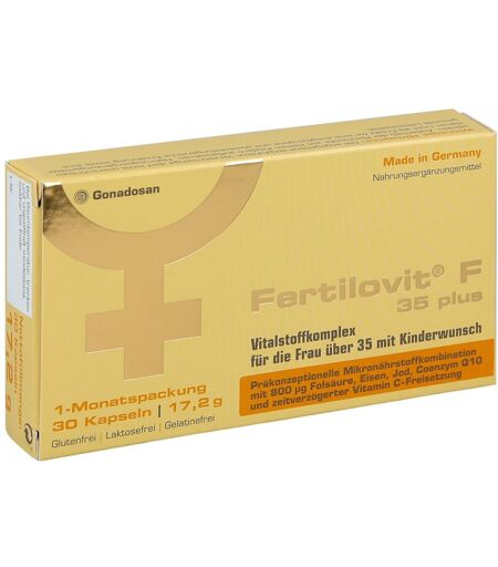 Anwendungsgebiet von Fertilovit F 35 plus KapselnFertilovit F 35 plus Kapseln ist ein Vitalstoffkomplex für die Frau mit Kinderwunsch.Wirkstoffe / Inhaltsstoffe / ZutatenZutaten von Fertilovit F 35 plus Kapseln:Magnesiumoxid, L-Ascorbinsäure, Hydroxypropylmethylcellulose, Eisencitrat, Coenzym Q10, Nicotinamid, D-alpha-Tocopherylacetat, Calcium-D-pantothenat, Zinkoxid, Pyridoxinhydrochlorid, Thiaminhydrochlorid, Riboflavin, Pteroylmonoglutaminsäure, Kaliumjodid, D-Biotin, Karottenkonzentrat, Cholecalciferol, Cyanocobalamin, Überzugsmittel Ethylcellose. Inhalt: pro Tagesdosis (1 Kapsel) % NRV* Vitamin C 100 mg 125 Vitamin E 20 mg 166 Vitamin B 1 3 mg 272 Vitamin B 2 3 mg 214 Pantothensäure 12 mg 200 Vitamin B6 4 mg 285 Vitamin B12 7 μg 280 Folsäure 800 μg 400 Vitamin D 5 μg 100 Niacin 35 mg 218 Biotin 200 μg 400 Zink 5 mg 50 Magnesium 100 mg 26 Jod 150 μg 100 Eisen 7,5 mg 54 Coenzym Q10 35 mg GegenanzeigenBei bekannter Überempfindlichkeit gegenüber einem der oben genannten Inhaltsstoffe sollte dieses Produkt nicht angewendet werden.DosierungVerzehrempfehlung von Fertilovit F 35 plus Kapseln: 3 Monate vor einer geplanten Schwangerschaft, bzw. einer geplanten Kinderwunschbehandlung. Nehmen Sie täglich eine Kapsel mit etwas Flüssigkeit zu sich.HinweiseBitte nehmen Sie täglich eine Kapsel mit etwas Flüssigkeit zu sich. Die angegebene empfohlene Verzehrmenge darf nicht überschritten werden. Außerhalb der Reichweite von kleinen Kindern aufbewahren. Nahrungsergänzungsmittel dienen nicht als Ersatz für eine ausge- wogene und abwechslungsreiche Ernährung sowie eine gesunde Le- bensweise. Fertilovit F 35 plus Kapseln können in Ihrer Versandapotheke www.juvalis.de erworben werden. ...