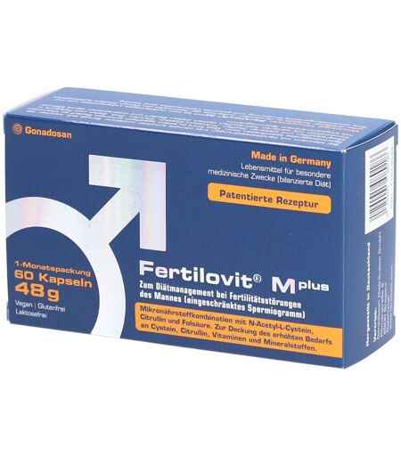 Bitte achten Sie auf eine abwechslungsreiche und ausgewogene Ernährung und gesunde Lebensweise.Fertilovit® M plusZur diätetischen Behandlung von Fertilitätsstörungen des Mannes (eingeschränktes Spermiogramm)Was ist Fertilovit® M plus und wie wirkt es? Fertilovit® M plus ist ein diätetisches Lebensmittel für besondere medizinische Zwecke (ergänzende bilanzierte Diät) und dient zur diätetischen Behandlung von Fertilitätsstörungen des Mannes bei eingeschränktem Spermiogramm. Eine Einschränkung der männlichen Samenqualität (des Spermiogrammes) ist eine zunehmende globale Erscheinung. Weltweit wird in diversen Studien eine rückläufige Zeugungsfähigkeit der Männer beschrieben. Bereits heute ist eines von 10 Paaren ungewollt kinderlos und die Tendenz ist steigend, wobei bei mindestens jedem dritten Paar die Ursache vorwiegend beim Mann zu suchen ist. Die Reproduktionsmedizin bietet einige Möglichkeiten, um Paaren mit unerfülltem Kinderwunsch doch noch zum Wunschkind zu verhelfen.Methoden wie Chlomiphenzyklen, Insemination, IVF oder ICSI sind sehr effektiv, um Ei- und Samenzelle zur Verschmelzung zu bringen - doch auch hier gilt: Samenzellen, die stark geschädigt sind, können auch mit diesen Methoden nicht zu einer erfolgreichen Befruchtung und anschließenden Schwangerschaft führen. Die Ursachen für eine Beeinträchtigung der Samenqualität und -quantität des Mannes sind vielfältig. Neben vielen anderen Faktoren werden häufig umweltbedingte Hormonbelastung, Umweltverschmutzung, einseitige Ernährung, sowie immer mehr auch oxidativer Stress verantwortlich gemacht. Unter oxidativem Stress versteht man die Schädigung der Zellen durch im Übermaß vorhandene aggressive Sauerstoffradikale. Insbesondere die Keimzellen (Samen und Eizellen) sind hier anfällig. Normalerweise hat der Körper eine Reihe von Abwehrmechanismen - körpereigene Antioxidantien“ - doch diese sind nicht immer im ausreichenden Maße vorhanden. Stress, Rauchen, aber auch ungesunde Ernährungsgewohnheiten sorgen dafür, dass es dem Körper an wichtigen Vitalstoffen fehlen kann. Eine gesunde Lebensführung und Ernährung kommt auch der Fruchtbarkeit zugute Die gute Nachricht vorweg: Da die Spermien immer wieder neu gebildet werden, kann ein gesunder Mann seine Spermienmenge und -qualität immer wieder durch seinen Lebensstil positiv beeinflussen. Eine gesunde Lebensführung mit einer ausgewogenen Ernährung, die reich ist an Antioxidantien und anderen Vitalstoffen, die wichtig für die Zellteilung im Allgemeinen und die Spermienentwicklung im Besonderen sind, kann dabei einen wichtigen Beitrag zur reproduktiven Fitness leisten.Manchmal fällt es im Alltag mit seinen vielfältigen Belastungen in Beruf und Freizeit jedoch schwer, angemessen auf eine gesunde und ausgewogene Ernährung zu achten. Dann kann die zusätzliche Zufuhr von speziellen Nährstoffen über Nahrungsergänzungsmittel und diätetische Lebensmittel sinnvoll sein. Antioxidantien Als Antioxidantien bezeichnet man Vitalstoffe, die die Erbinformation,... ...