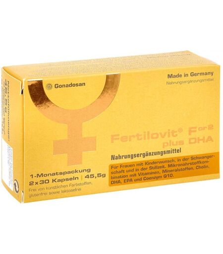 Anwendungsgebiet von Fertilovit For2 Plus DhaFertilovit For2 Plus Dha ist ein Nahrungsergänzungsmittel mit einer Mikronährstoffkombination aus Vitaminen, Mineralstoffen, Cholin, DHA, EPA und dem Coenzym Q10. Es ist speziell für Frauen mit Kinderwunsch, in der Schwangerschaft sowie in der Stillzeit entwickelt worden. Fertilovit For2 Plus Dha ist frei von laktose, Gluten und Farbstoffen.Wirkstoffe / Inhaltsstoffe / ZutatenZutaten Vitamin- und Mineralstoffkapsel: Cholinbitartrat, Magnesiumoxid, Hydroxypropylmethylcellulose, L- Ascorbinsäure, Eisencitrat, Coenzym Q10, Nicotinamid, D-alpha- Tocopherylacetat, Zinkoxid, Calcium-D-pantothenat, Karottenkon- zentrat, Thiaminhydrochlorid, Pyridoxinhydrochlorid, Riboflavin, Pteroylmonoglutaminsäure, Kaliumjodid, Natriumselenit, D-Biotin, Cholecalciferol, Cyanocobalamin, Überzugsmittel Ethylcellose. Zutaten Fischölkapsel: Fischölkonzentrat, Gelatine (Rind), Feuchthaltemittel Glycerin, Antioxidationsmittel stark tocopherolhaltige Extrakte. Zusammensetzung pro Tagesdosis: Die Zusammensetzung von Fertilovit For2 Plus Dha entspricht den besonderen Erfordernissen von Frauen mit Kinderwunsch, zur Schwangerschaft und zur Stillzeit: Vitamin D: 20 µg (400%*) Vitamin E: 12 mg α-TE (100%*) Vitamin C: 80 mg (100%*) Thiamin: 1,1 mg (100%*) Riboflavin: 1,4 mg (100%*) Niacin: 16 mg NE (100%*) Vitamin B6: 1,4 mg (100%*) Folsäure: 400 µg (200%*) Vitamin B12: 5,5 µg (220%*) Biotin: 50 µg (100%*) Pantothensäure: 6 mg (100%*) Magnesium: 100 mg (26%*) Eisen: 7,5 mg (54%*) Zink: 5 mg (50%*) Selen: 60 µg (109%*) Jod: 150 µg (100%*) * Nutrient reference values (Referenzmenge) laut EU-Lebensmittelinformationsverordnung (LMIV) und Schweizer Verordnung des EDI betreffend die Information über Lebensmittel (LIV) Fertilovit For2 Plus Dha ist frei von ...